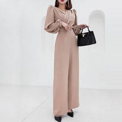 パンツドレス オールインワン 長袖 秋冬 春秋 ロングパンツ レディース フォーマル オーバーオール Vネック 体型カバー ハイウエスト ワイドパンツ フェミニン 結婚式 OL 高級感 上品 入学式 | koookooo