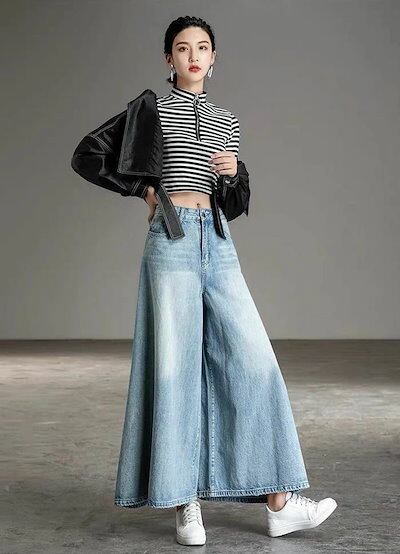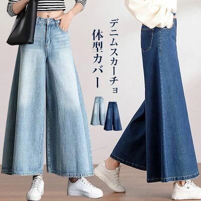 ジーンズ スカーチョ デニム ロングパンツ ワイドパンツ デニム デニムパンツ デニムスカーチョ レディース きれいめ 股上深め 大きいサイズ 春夏秋冬 フレアパンツ ゆったりシルエット おしゃれ 体 | koookooo
