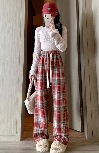 ロングパンツ 裏起毛 厚め 保温性 チェック柄 イージーパンツ ゴムウエスト おしゃれ 秋冬 ワイドパンツ レディース ボトムス 体型カバー 脚長効果 着痩せ ロング丈 パンツ ゆったり 美脚 可愛い | koookooo