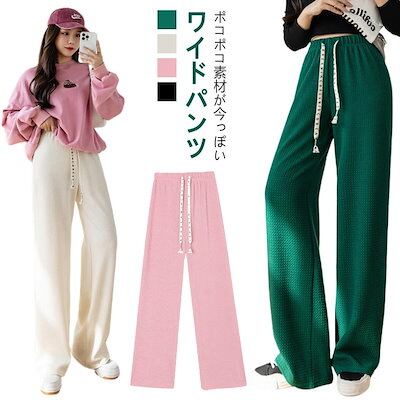 ワイドパンツ ぽこぽこ加工 ポップコーン エンボス加工 凹凸感 立体的 紐付き ストレートパンツ レディース ロング丈 パンツ ボトムス 楽ちん キレイめ 体型カバー カジュアル 春 夏 秋 | koookooo