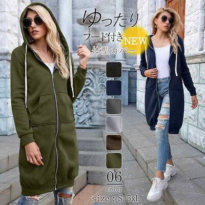 パーカー レディース ロング アウター フード付き ゆったり ジップパーカー ライトアウター 羽織り 無地 体型カバー 大きいサイ
