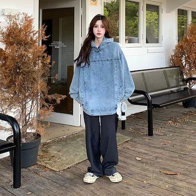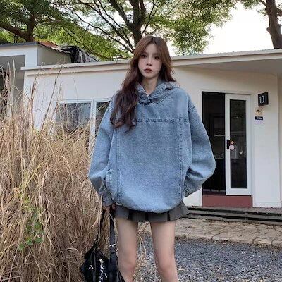 パーカー レディース フード付き 長袖 デニムパーカー デニムジャケット 韓風ファッション オーバーサイズ プルオーバー トップス 秋 アウター 大きめ 可愛い