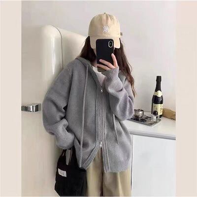 春アウター パーカー ニット カーディガン 長袖 フード付き 韓国ファッション 高級感  ダブルファスナー レディース ゆったり 着やせ カジュアル トップス 体型カバー