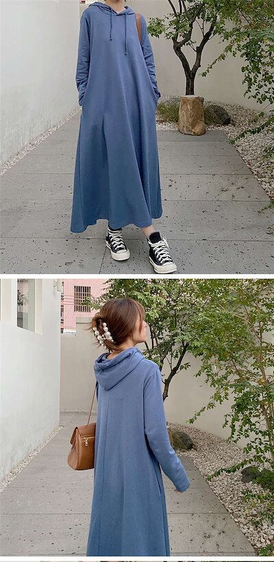 パーカーワンピース ワンピース ロング レディース ワンピース 春秋冬 長袖 ロング丈 マキシワンピース トレーナー スウェット プルオーバー 無地 体型カバー フード付き スエット カジュアル ロン | koookooo