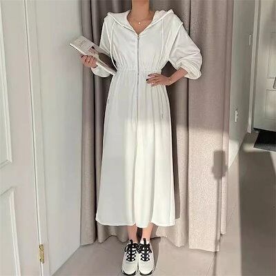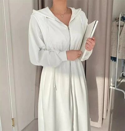 パーカーワンピース レディース 長袖 ジップアップ フード付き パーカー ワンピース フレア ロング ミモレ ファスナー ウエストゴム ガーリー フェミニン 可愛い 春 秋 冬 ブラック グレー ホワ | koookooo