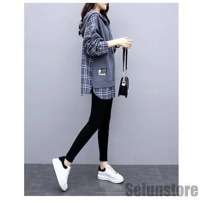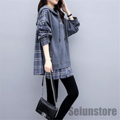 超目玉新品 パーカー レディース 春夏 プルオーバー 配色 レイヤード風 長袖 チェック 重ね着風 フード付き カジュアル 可愛い カジュアル 秋冬 カットソー 40代 50代