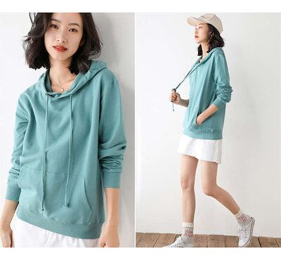 パーカー レディース 秋 春 長袖 綿 コットン トレーナー フード付き 春秋 パーカー トップス 重ね着 レイヤード風 無地 シンプル ゆったり カジュアル 大きいサイズ ゆるっと 着?せ お洒落 | koookooo
