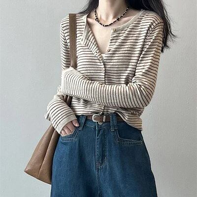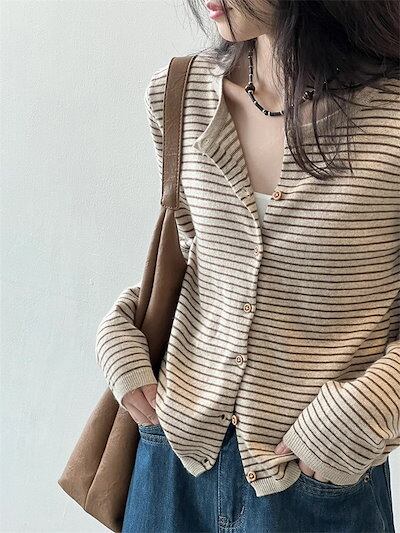 ニットカーディガン レディース トップス 前開き アウター ゆったり 春 秋 ニット カジュアル ボーダー 無地 キレイめ 柔ら 大人可愛い ショート丈 エレガント 着?せ ベーシック 長袖 トレンド | koookooo