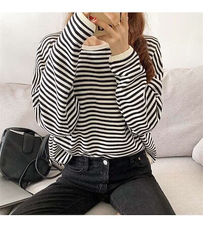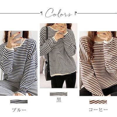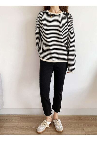 ボーダー カットソー 長袖 Tシャツ レディース 春 秋 長袖トレーナー トップス プルオーバー クールネック パーカー プルオーバー ドロップショルダー シャツブラウス ブラウス 細ボーダー 大きい | koookooo