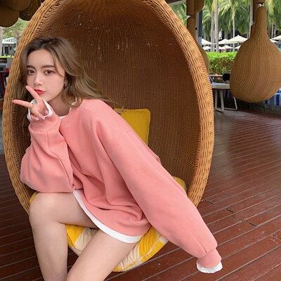 レイヤードトップス 韓国 パーカー ピンクラウンドネックフードレスセーター女性春と春の薄いセクションの新しいトップコート 長袖ブラウス