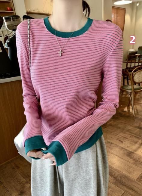 2024春秋新作 レディース 女 長袖 ボーダー柄 丸首 Tシャツ トップス インナー