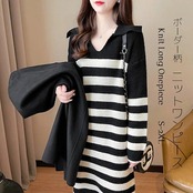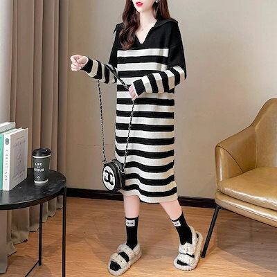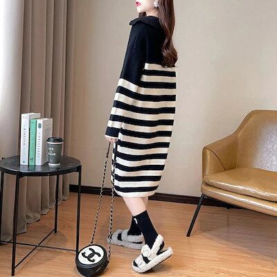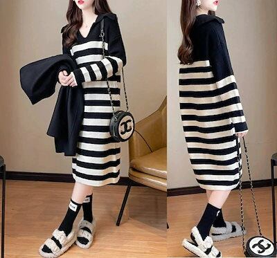 ニットワンピース 秋冬 ロング ロングワンピース 厚手 ニット ワンピース レディース ボーダー柄 Vネック ロングワンピース丈 ミモレ 膝丈 ミモレ丈 ワンピ ロングワンピ ニットワンピ セーター | koookooo