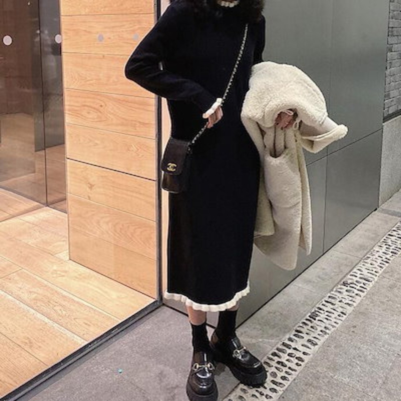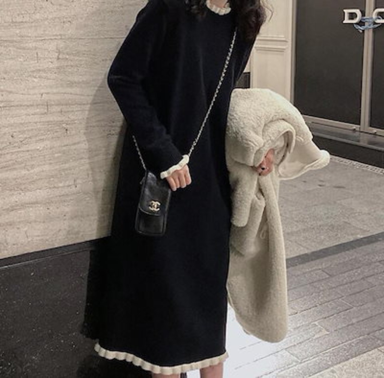ニットワンピース ワンピース レディース ロング 膝下 春 秋 冬 長袖 フリル袖 フリルネック おしゃれ きれいめ ゆったり 体型カバー 通勤 通学 カジュアル 大人 かわいい 着やせ 20代 30 | koookooo
