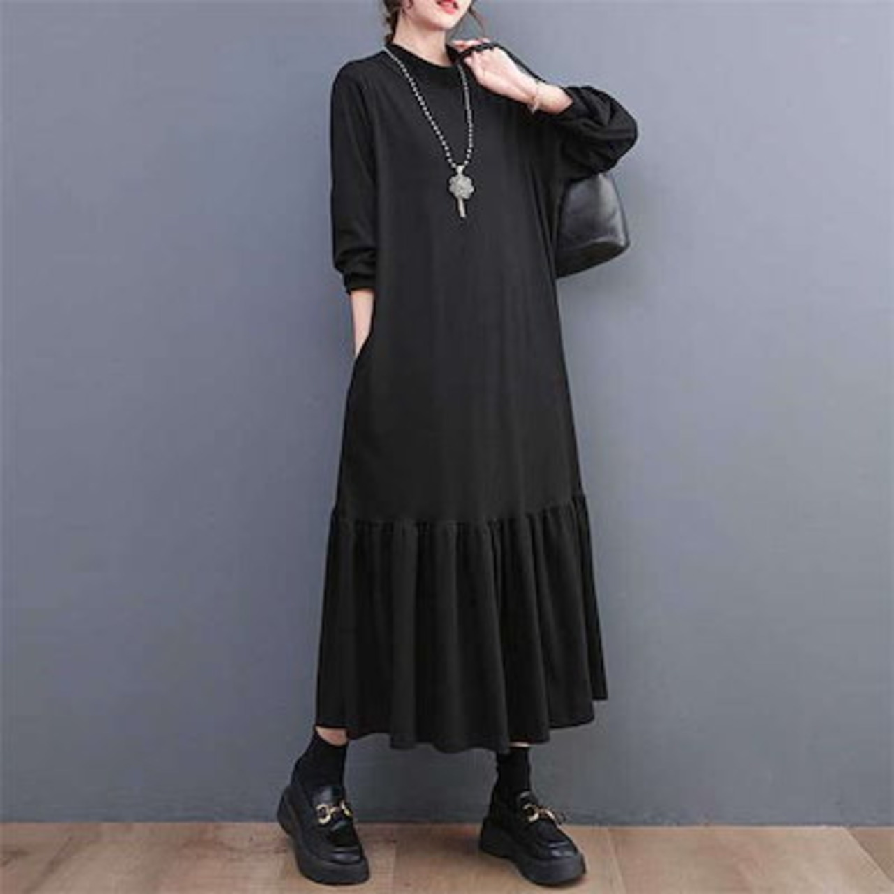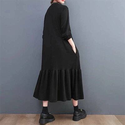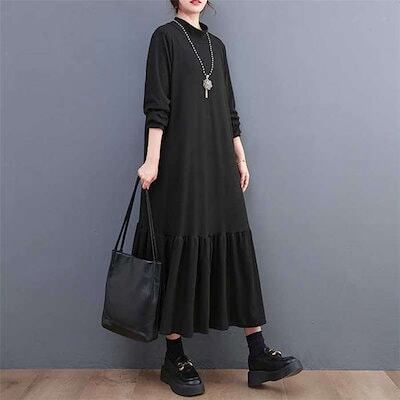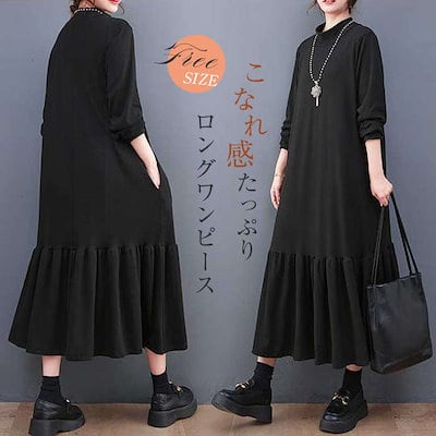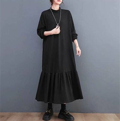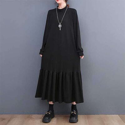 ロングワンピース レディース 長袖 マーメイドワンピース 秋 冬 黒 大きいサイズ フレアワンピース 春秋 きれいめ マキシ丈 無地 ハイネック マキシワンピース ビッグシルエット ゆったり カジュア | koookooo