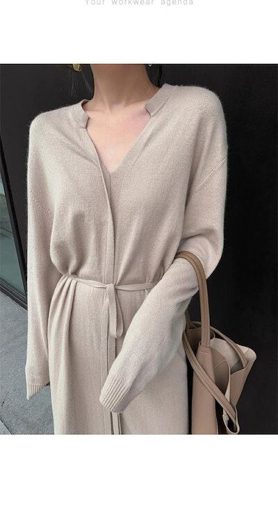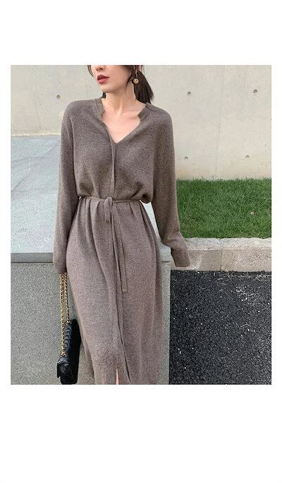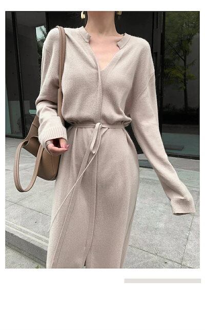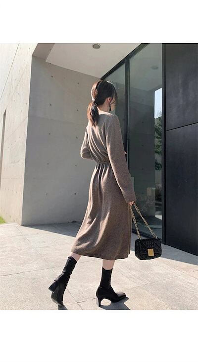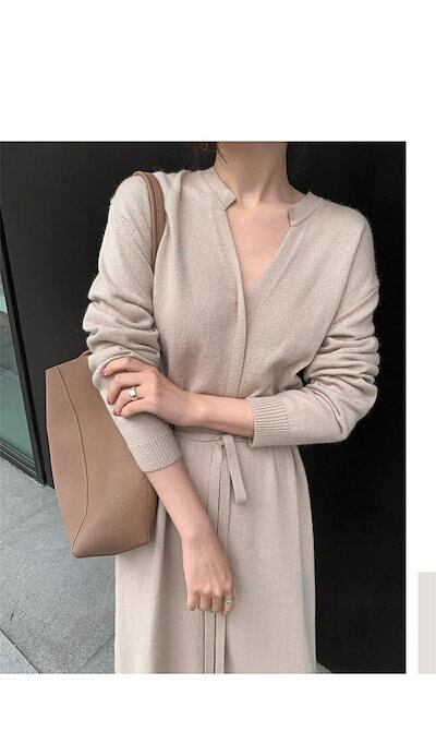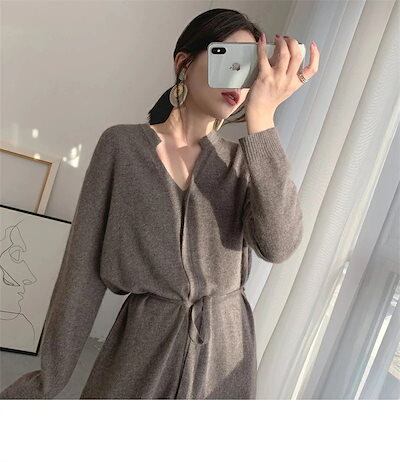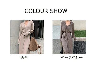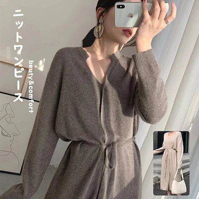 ニットワンピース ワンピース レディース ニット Aラインワンピース リブニット ロングワンピース 長袖 Vネック 秋 冬 ロングワンピ ニットワンピ ウエストベルト Aライン ゆるっと シンプル | koookooo