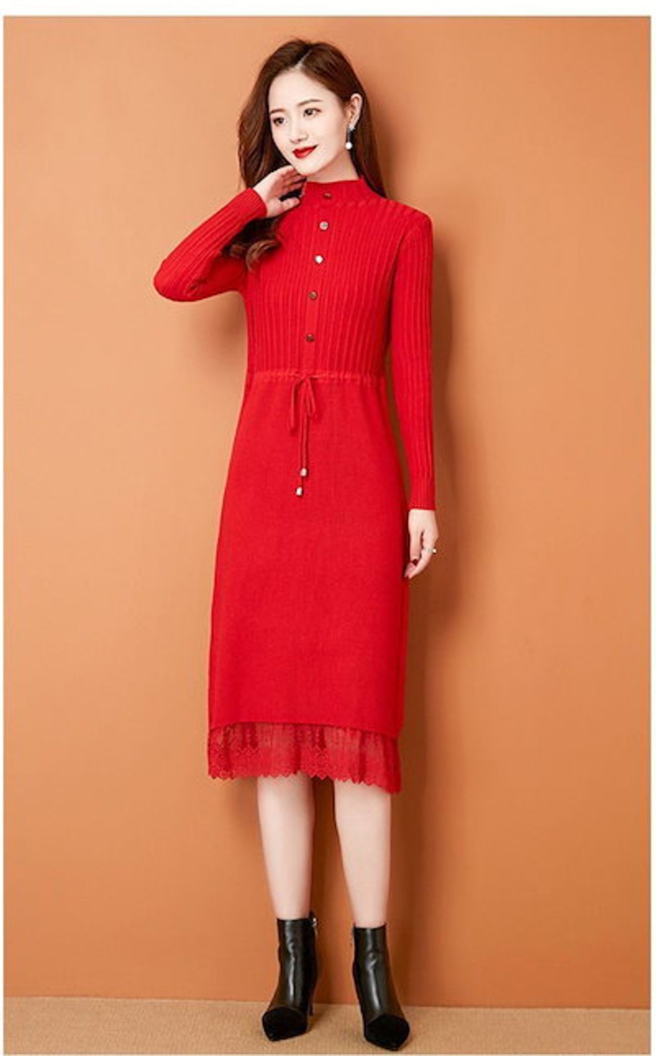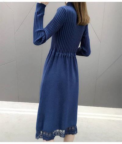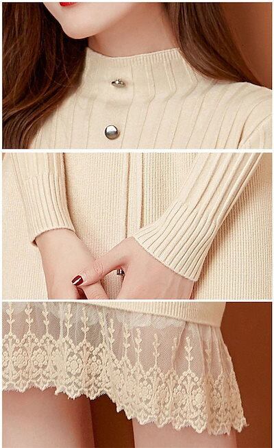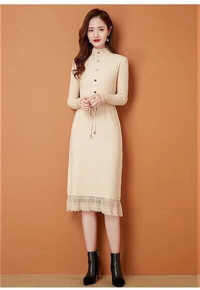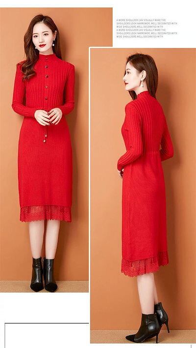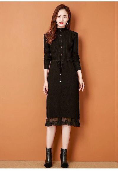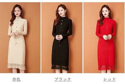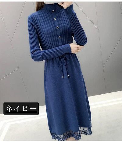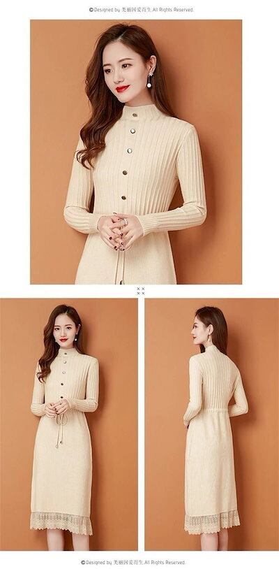 ニットワンピース レディース 秋冬 プチハイネック ロングワンピース ミモレ丈 長袖 セーター ワンピース トップス ハイネック レース付き 秋 冬 Aライン 体型カバー 無地 ボタン飾り 切替 イン | koookooo