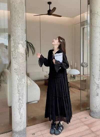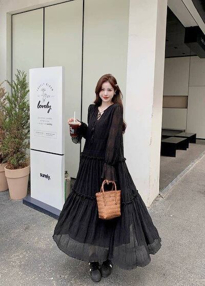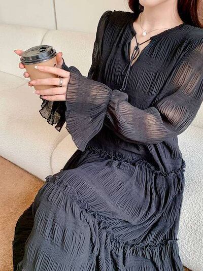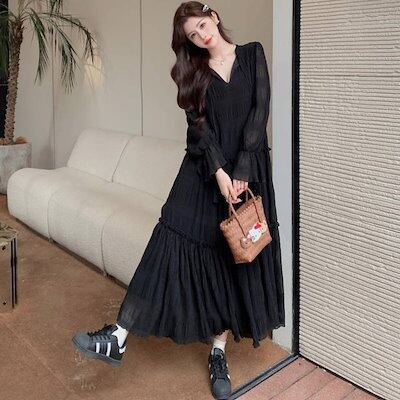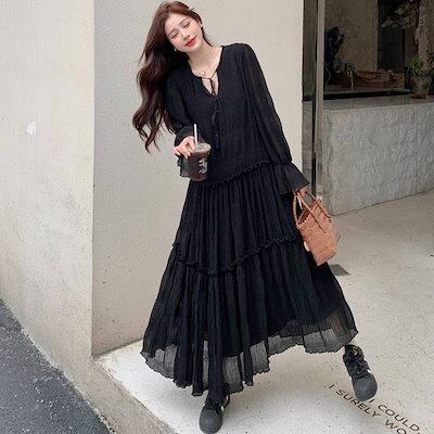 【9月新作】ワンピース レディース Vネック ロングワンピース フレア袖 ワンピース 秋冬 春 長袖 ブラック きれいめ ゆったり