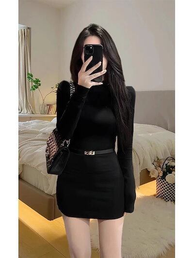 【9月新作】ワ 韓国 冬 ワンピース 秋冬 ワンピース ドレス レディース ワンピース スリムタイトスキニーボトムスカートショートスカート 秋冬新作 ハーフハイネックロングスリーブブラックワンピース | koookooo
