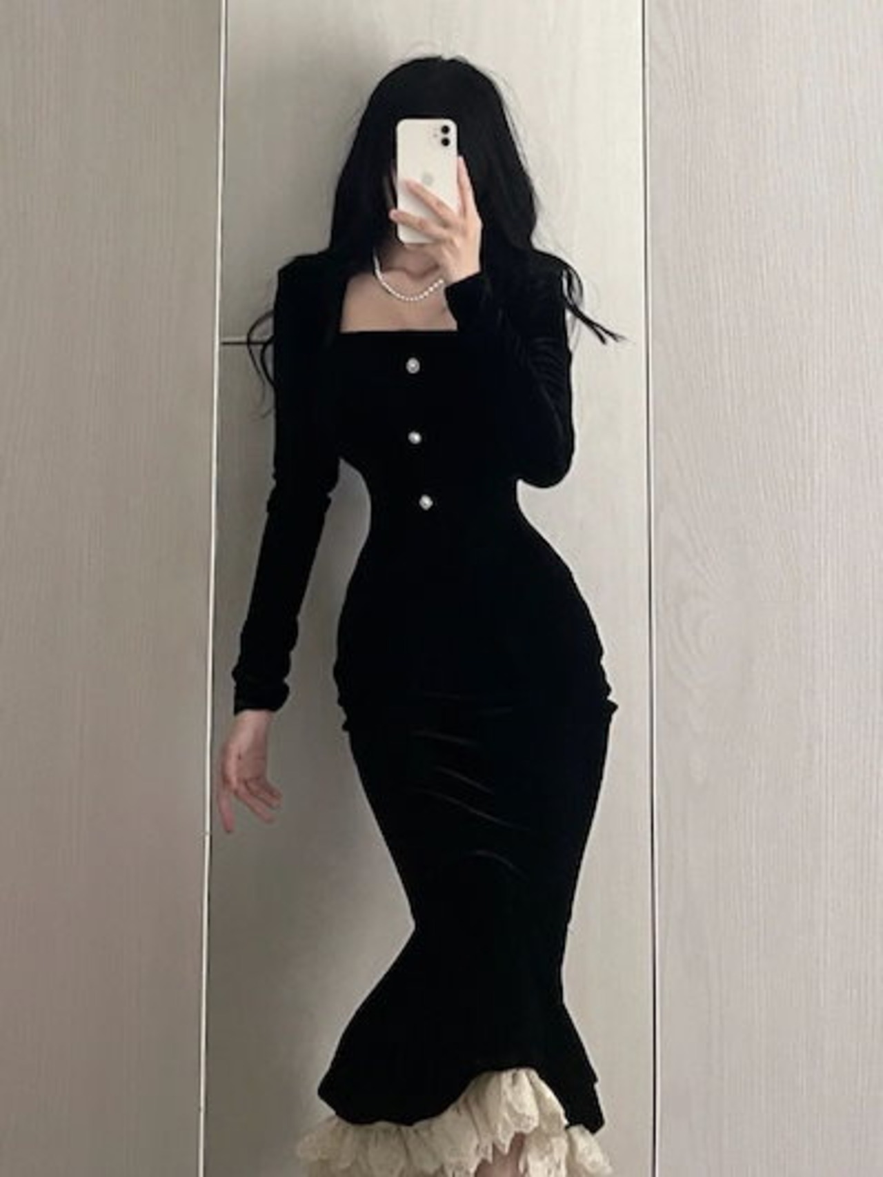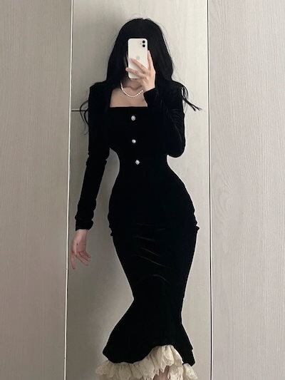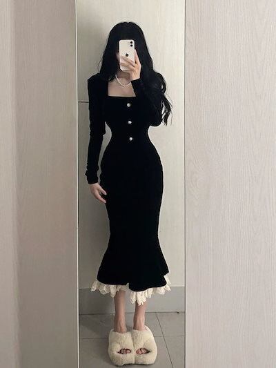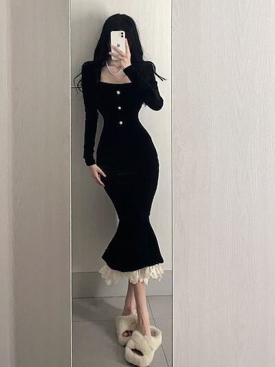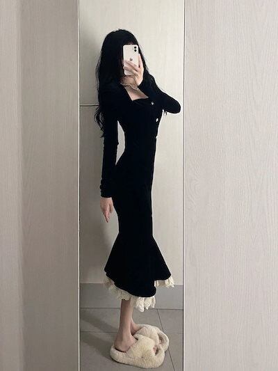 【9月新作】ワンピース 韓国 冬 ワンピース 秋冬 ワンピース ドレス レディース ワンピース 威厳のあるガウン 細身ヒップレトロロングスカート ブラックベルベットフィッシュテール秋と冬のドレス | koookooo