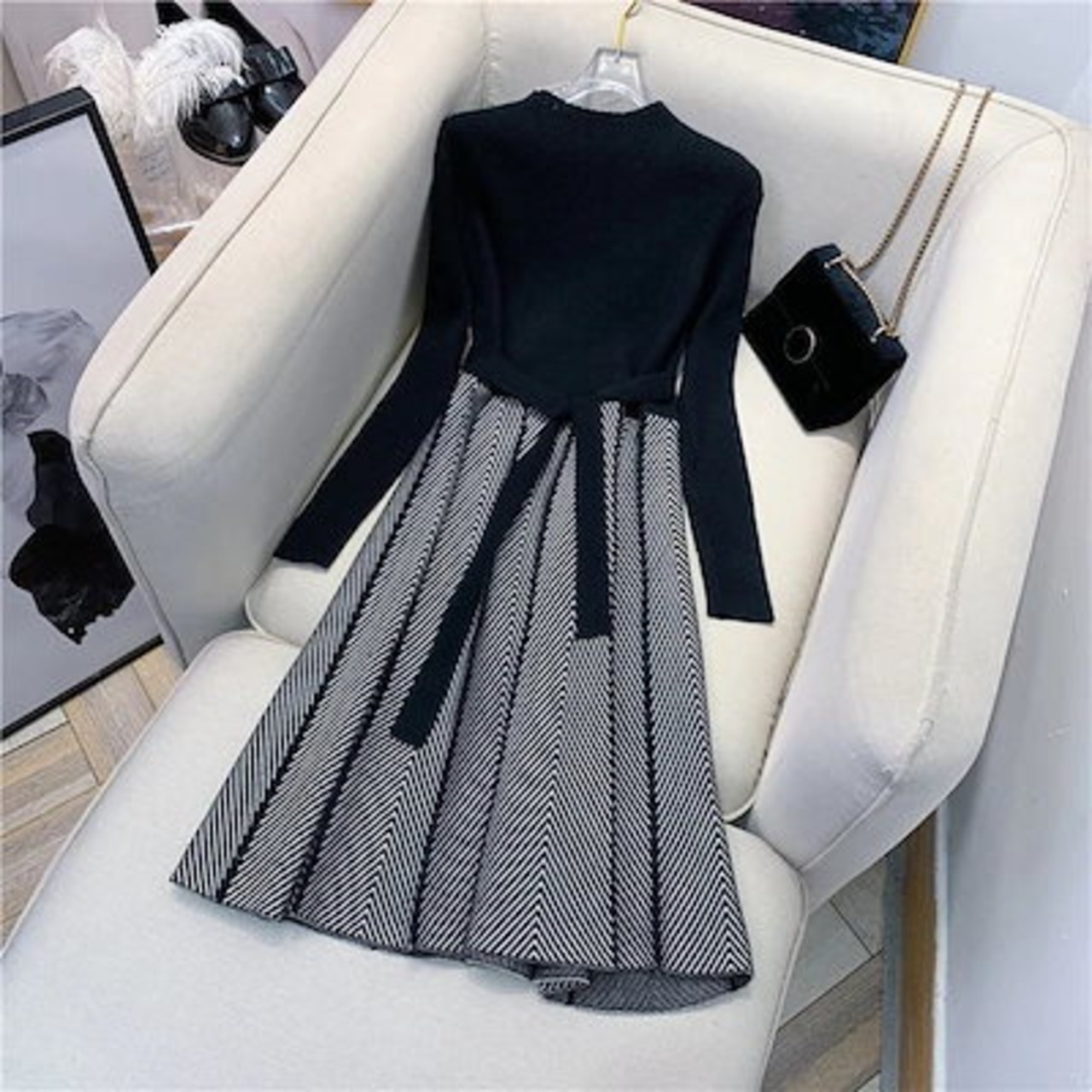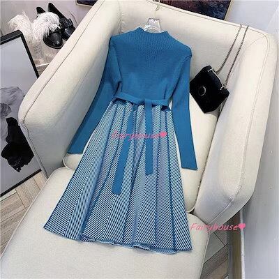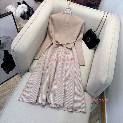 【限定SALE】オシャレ 着痩せ ロング 通勤 結婚式ドレス ニット Aラインプリーツスカート リボン 長袖 膝丈ワンピース きれいめ 秋冬 40代 レディース ニットワンピース 韓国おしゃれ | koookooo