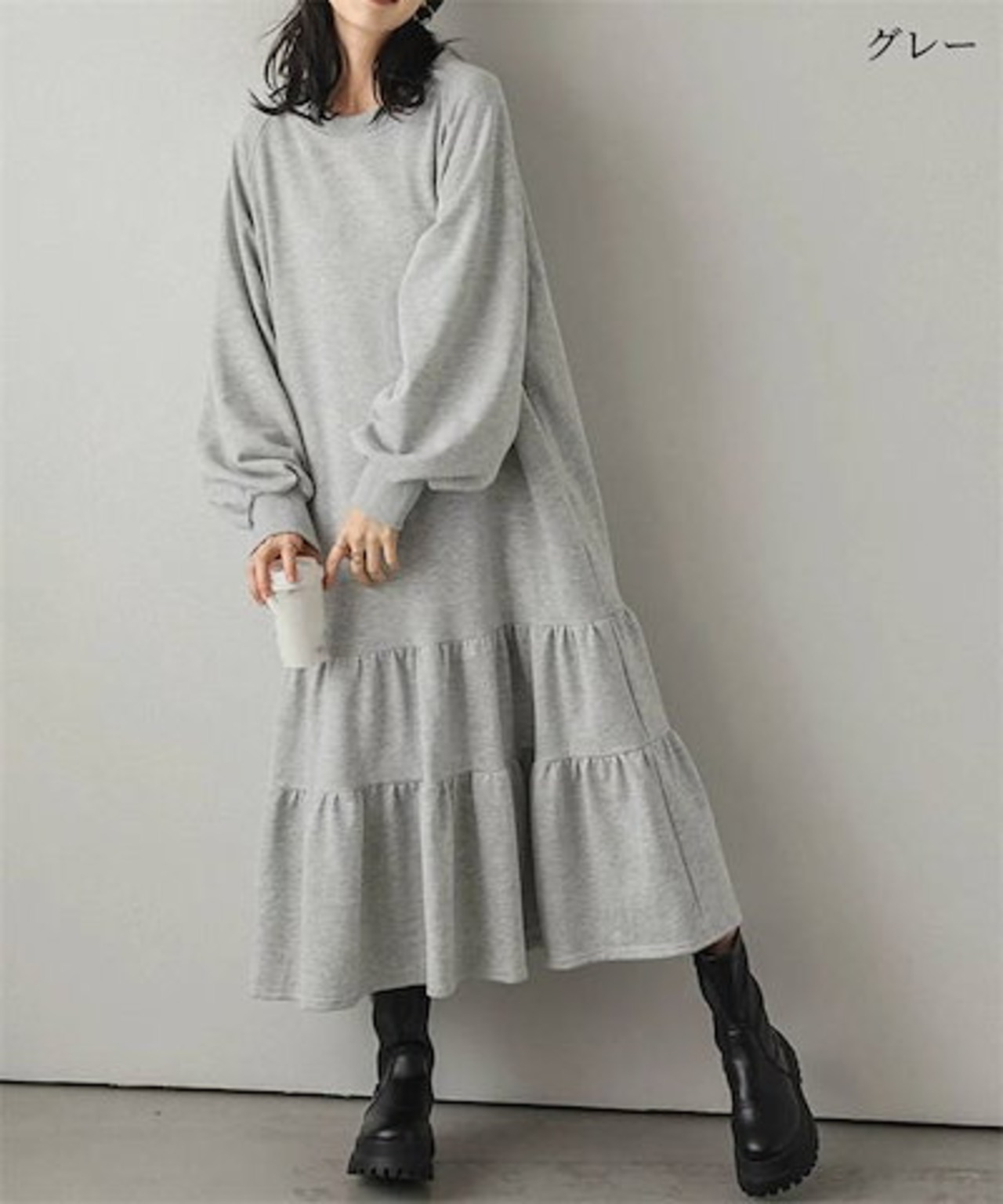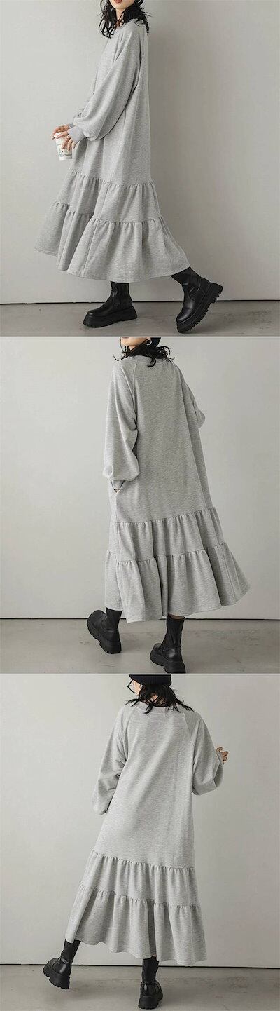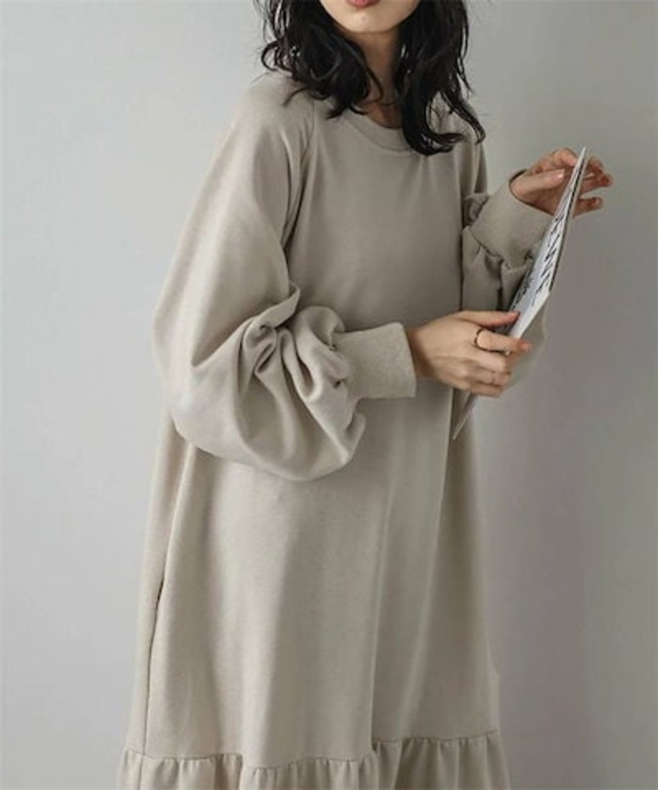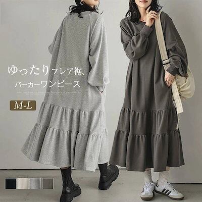 【限定SALE】可愛い お洒落 体型カバー 冬 秋 春 ベーシック ワンピ ロング プルオーバー ロングワンピース ラウンドネック 無地 長袖 バルーン袖 フリル 綿 パーカーワンピース レディース | koookooo