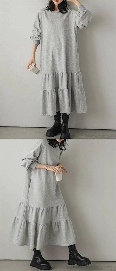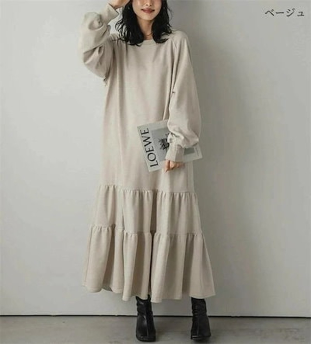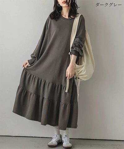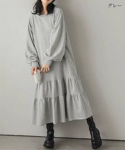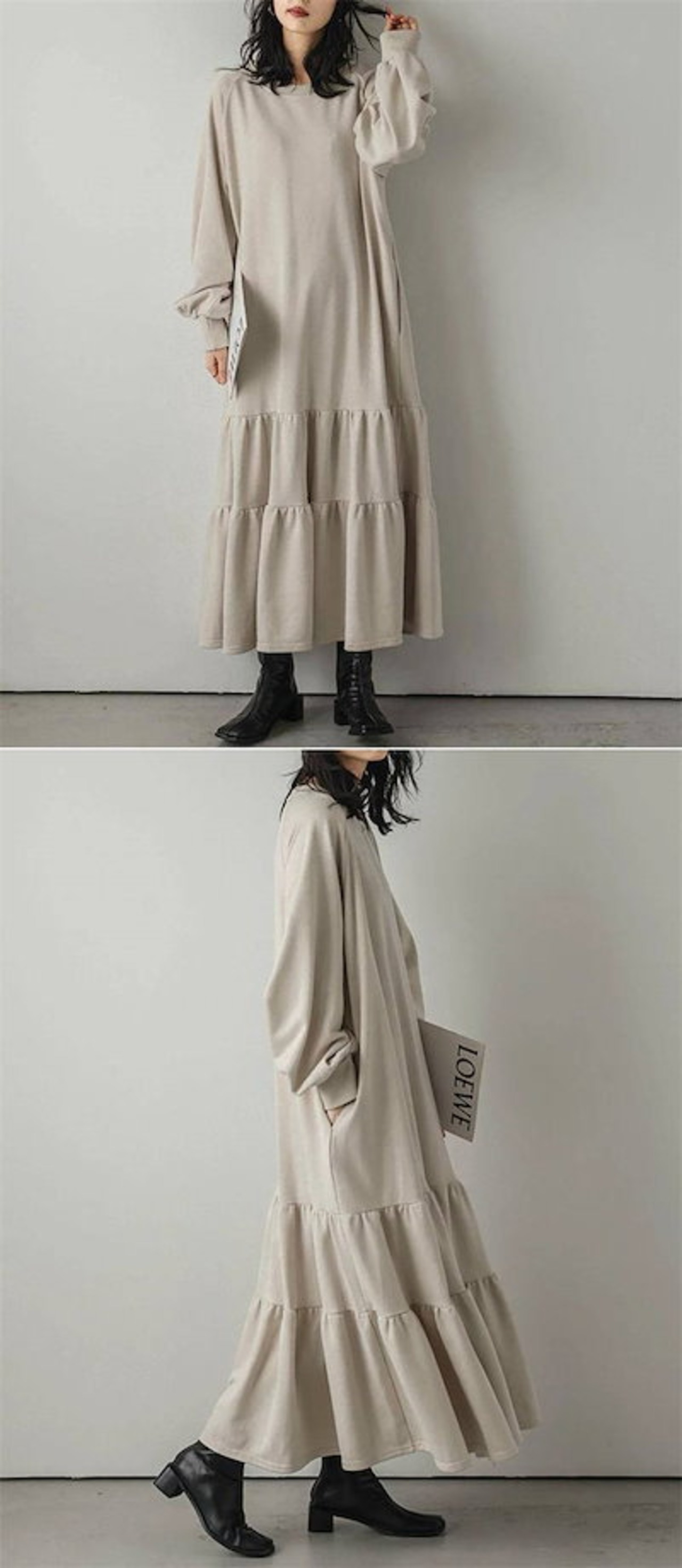 【限定SALE】可愛い お洒落 体型カバー 冬 秋 春 ベーシック ワンピ ロング プルオーバー ロングワンピース ラウンドネック 無地 長袖 バルーン袖 フリル 綿 パーカーワンピース レディース | koookooo