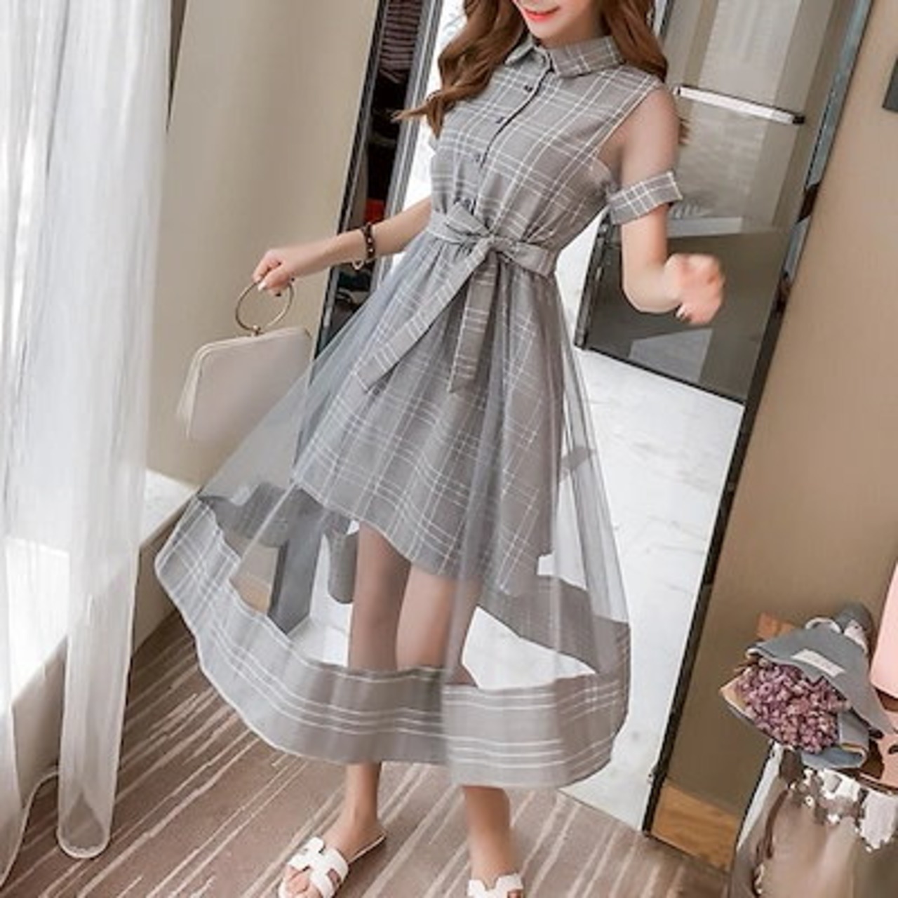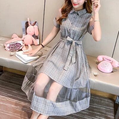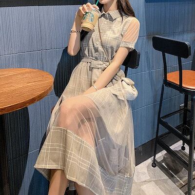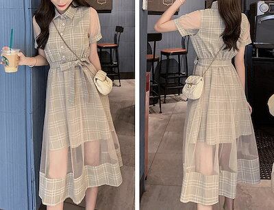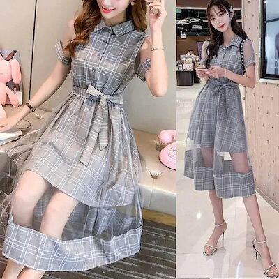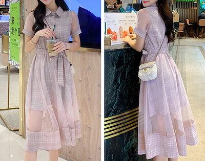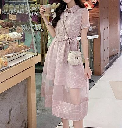 チェック柄灰色ピンク襟付き 半袖 ミモレ丈 ひざ下丈ガーリーカジュアル上品きれいめ透け感シースルーシアーフレアデート女子会大人レディース旅行ショート丈ハーフボタン清楚量産型地雷ワンピー | koookooo