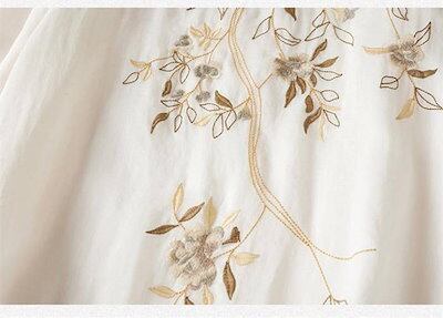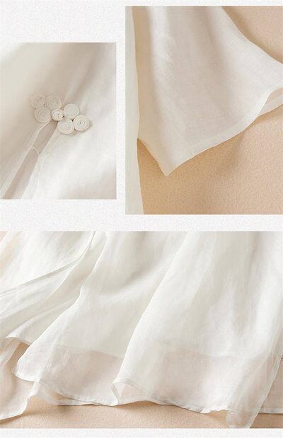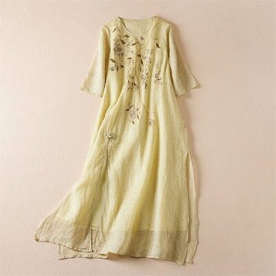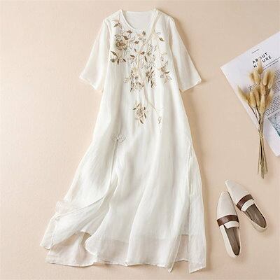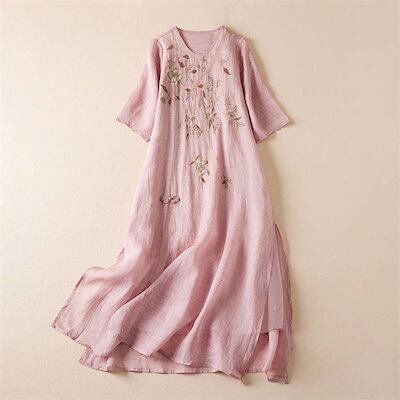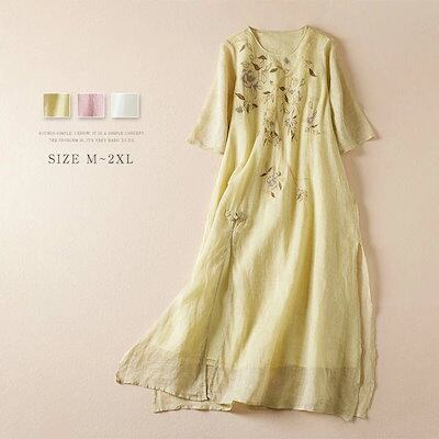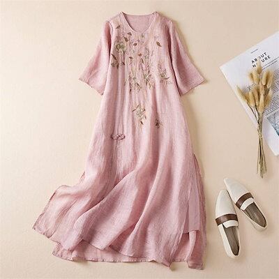 ワンピース レディース 夏 綿麻 五分袖 半袖ワンピース 花柄 刺繍 スリット チャイナボタン リネン コットン 春 Aラインワンピース エレガント フレア きれいめ シンプル スッキリ ナチュラル | koookooo