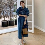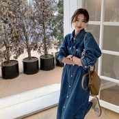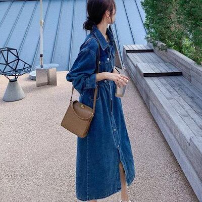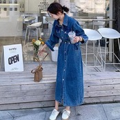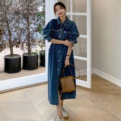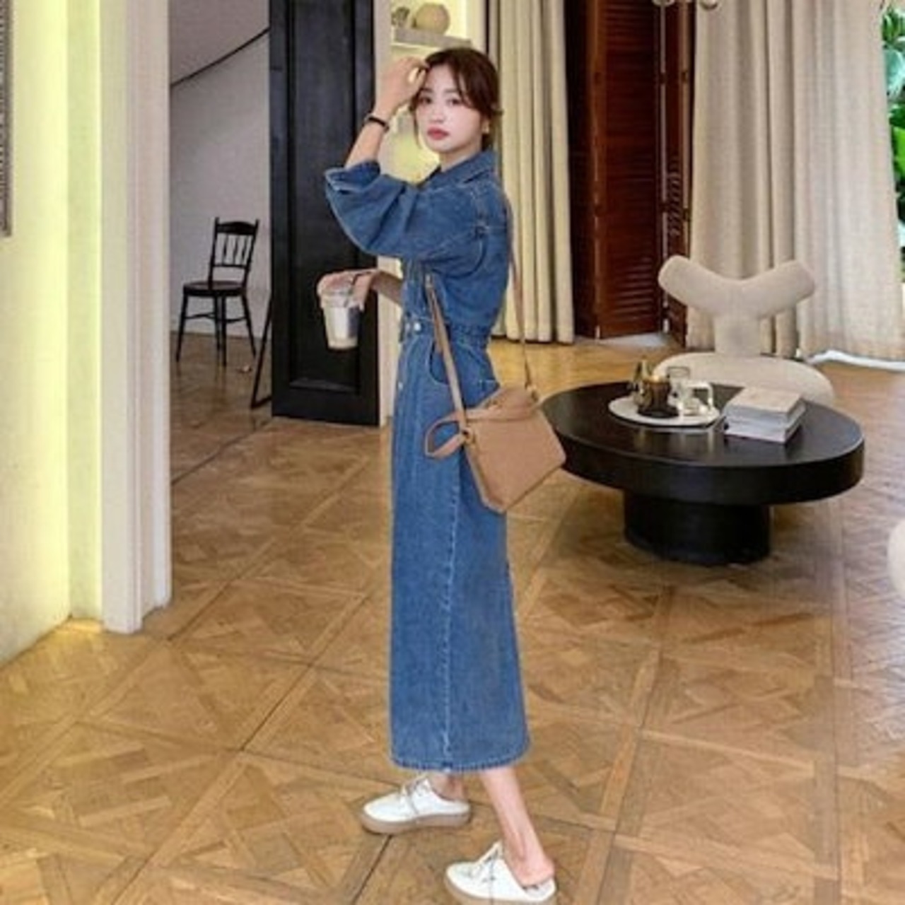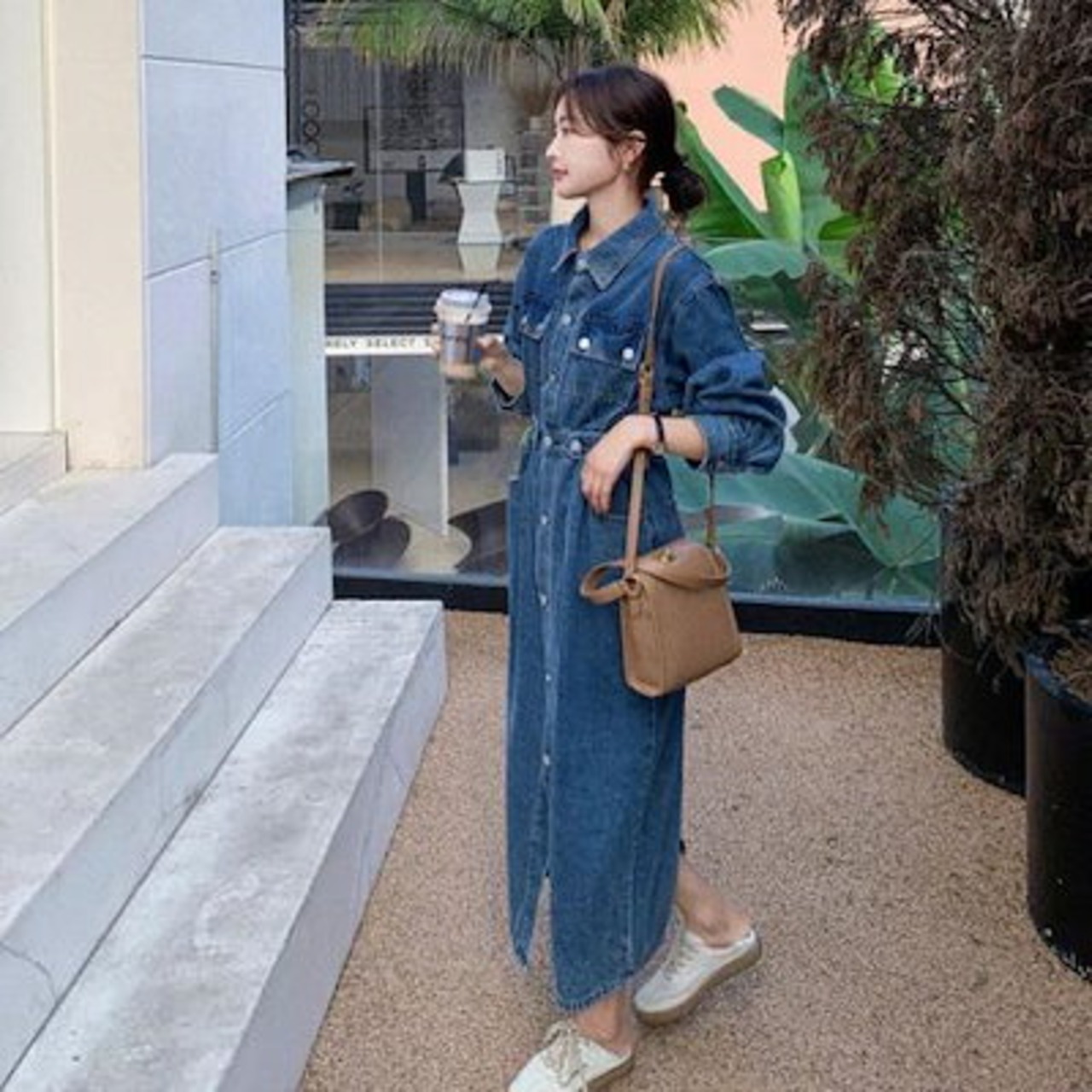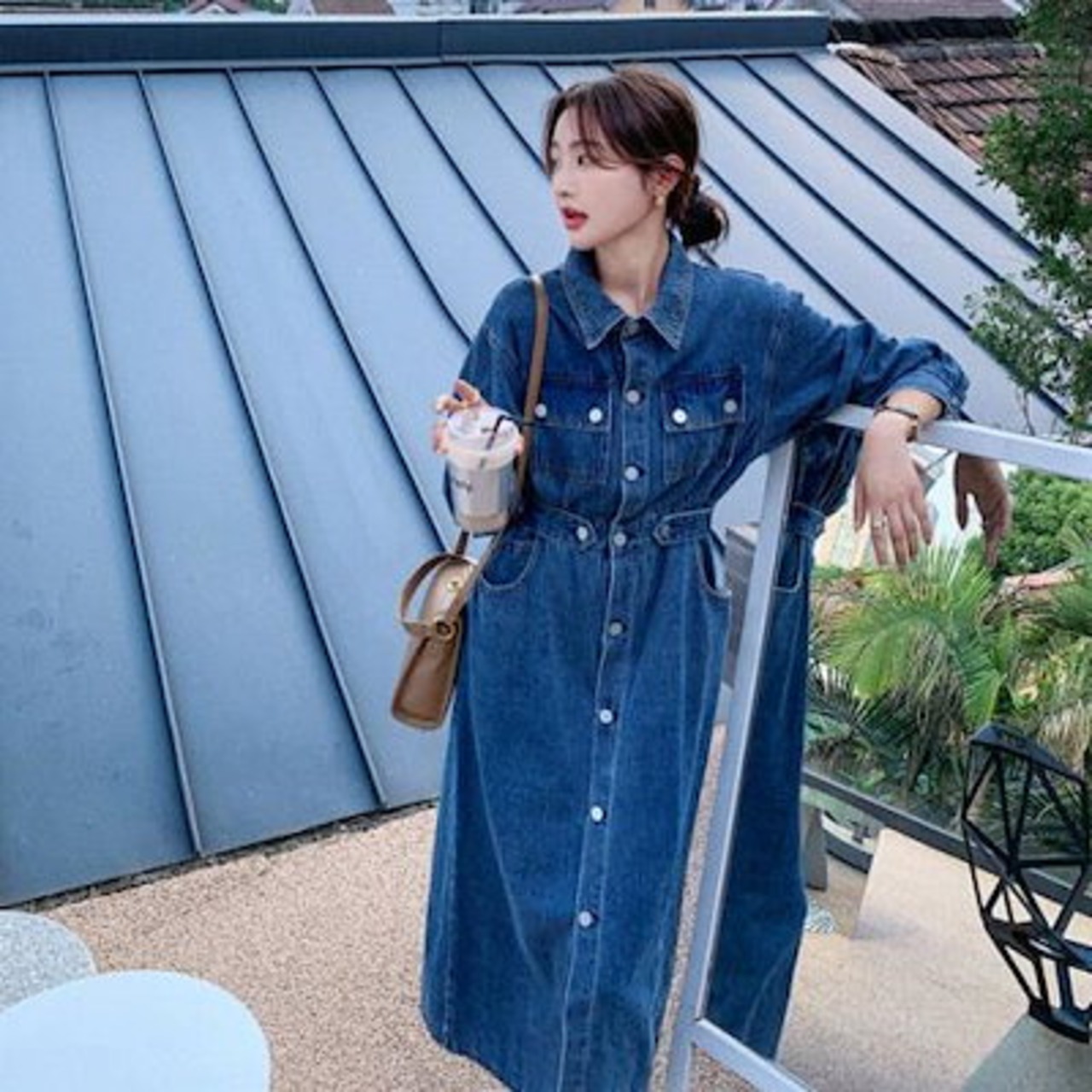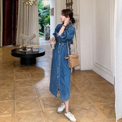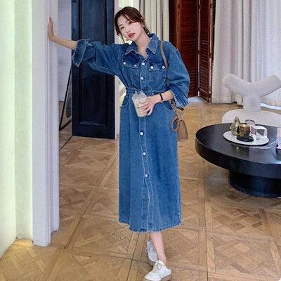 売り切れ注意デニム シャツ ワンピース ロング ジーンズ 長袖 韓国 オーバーシャツ 春 秋 冬 レディース デニムシャツワンピース シャツワンピース 襟付き 大人可愛い 前開き フロントボタン ウエ | koookooo