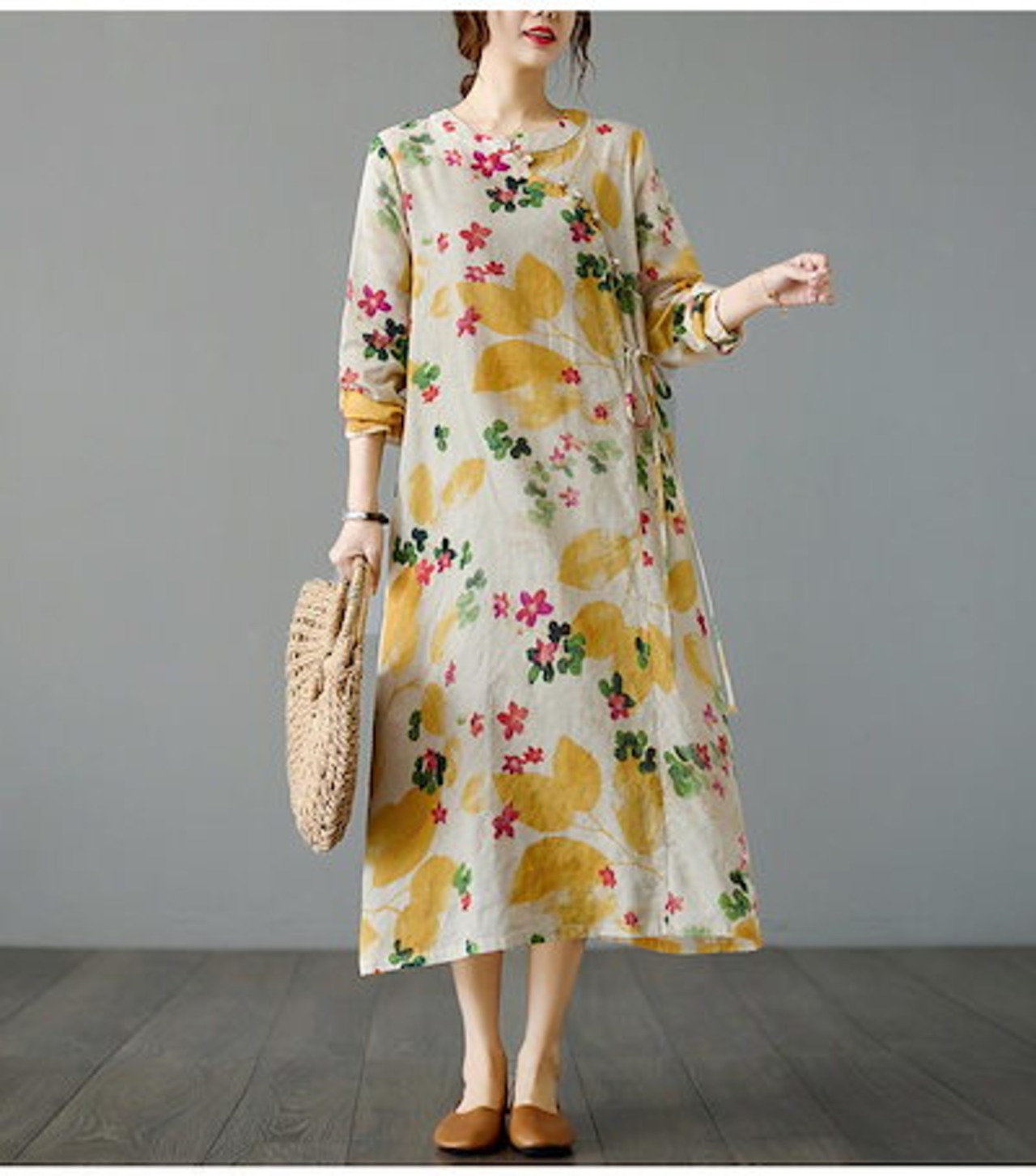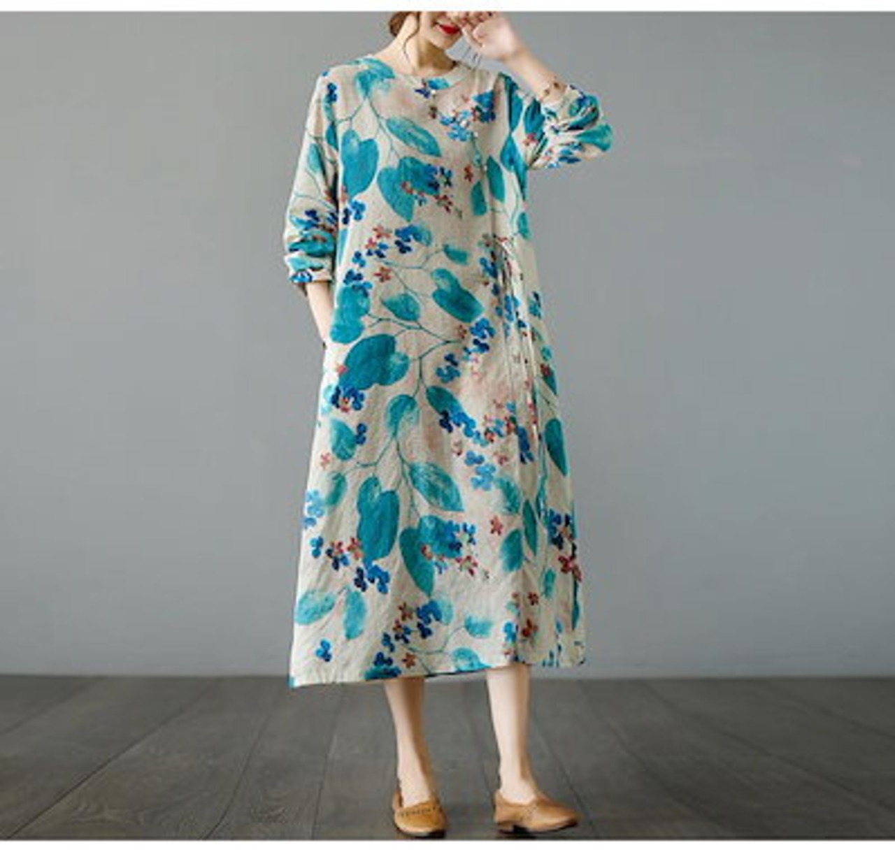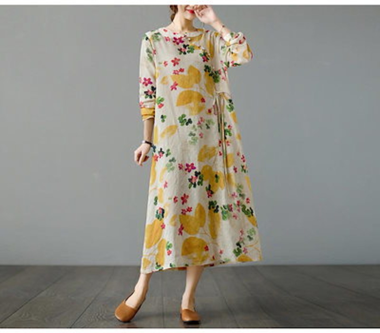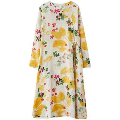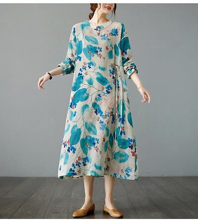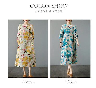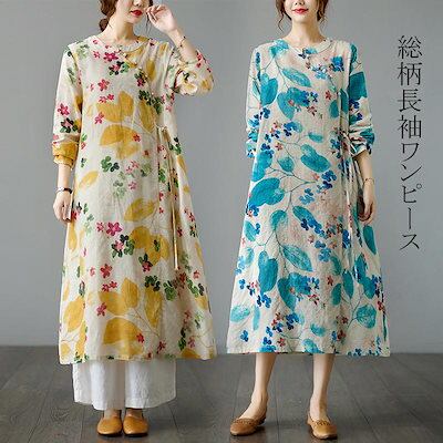 マキシワンピース フレアワンピ ワンピ ロングワンピース ロングワンピ 綿 レディース 長袖 総柄 花柄 プリント デザインネック 斜めボタン ウエスト紐づき ポケットづき チャイナ風ワンピース ゆっ | koookooo