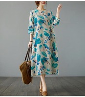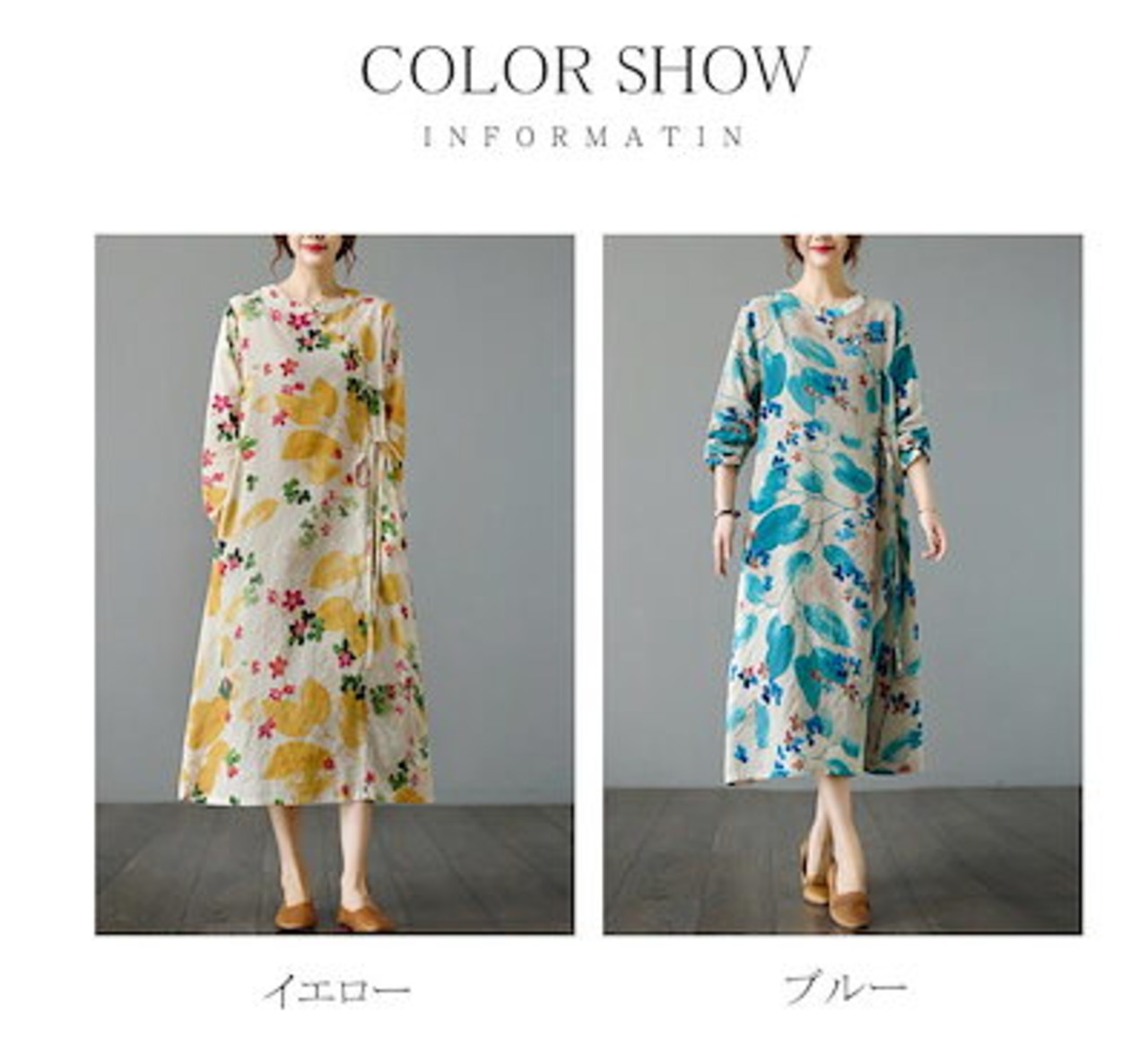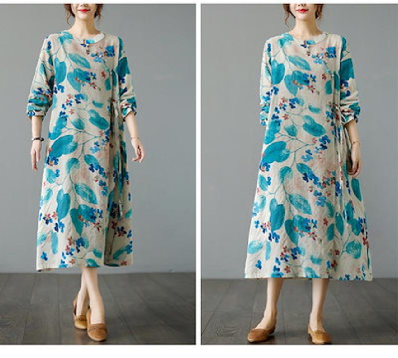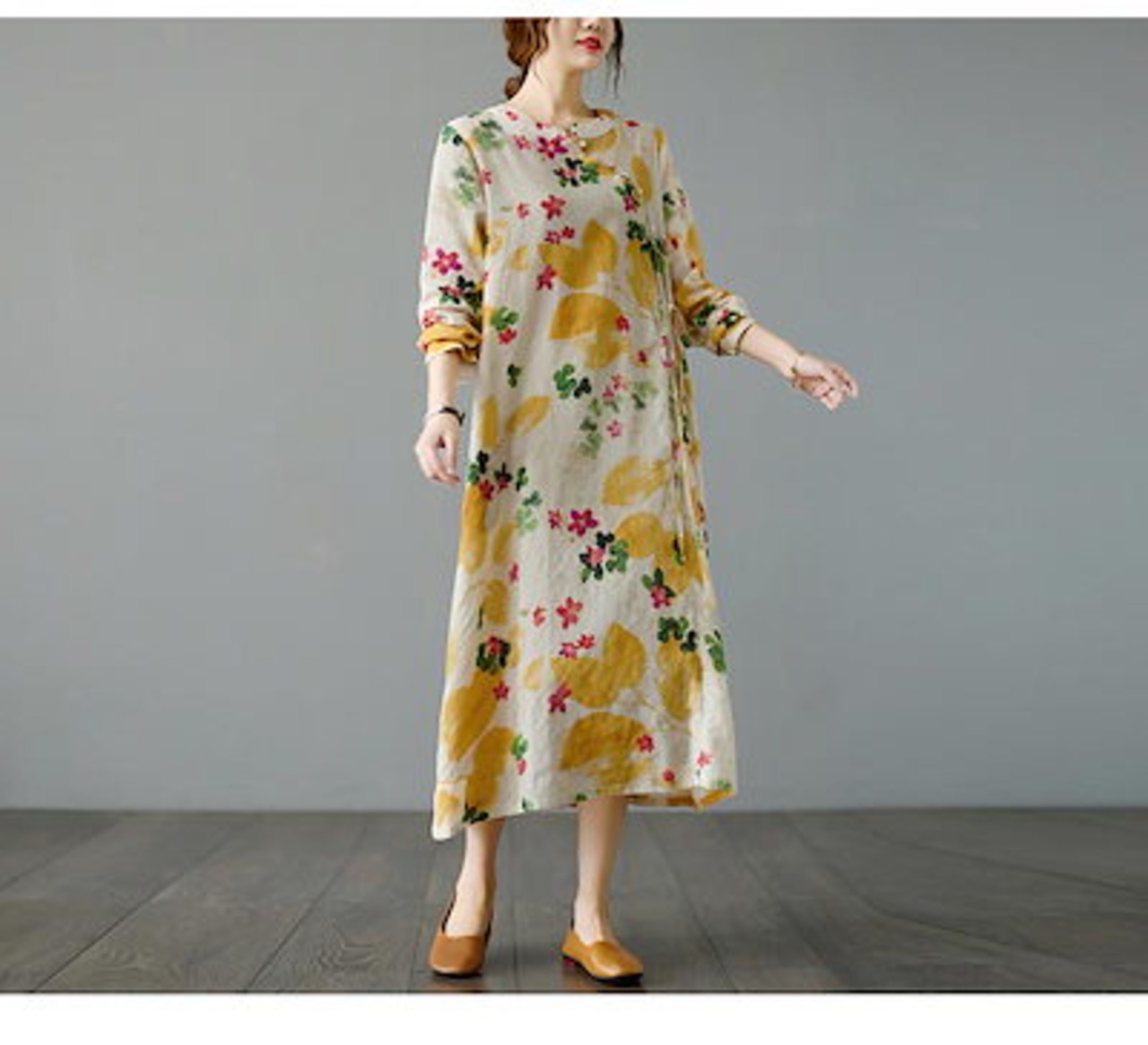 マキシワンピース フレアワンピ ワンピ ロングワンピース ロングワンピ 綿 レディース 長袖 総柄 花柄 プリント デザインネック 斜めボタン ウエスト紐づき ポケットづき チャイナ風ワンピース ゆっ | koookooo