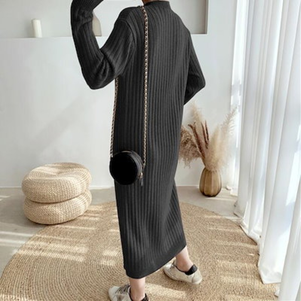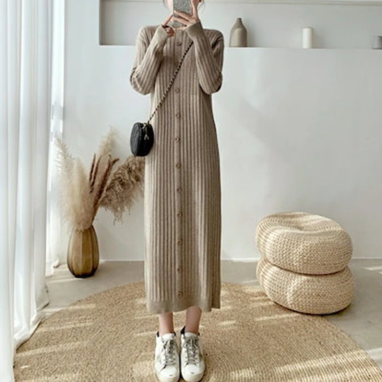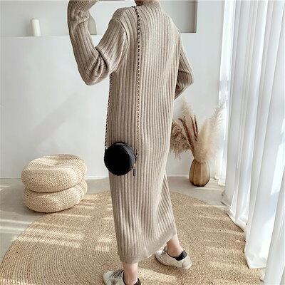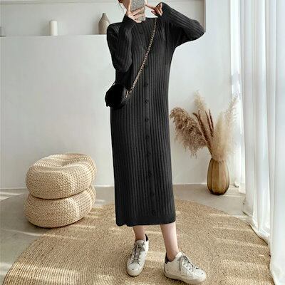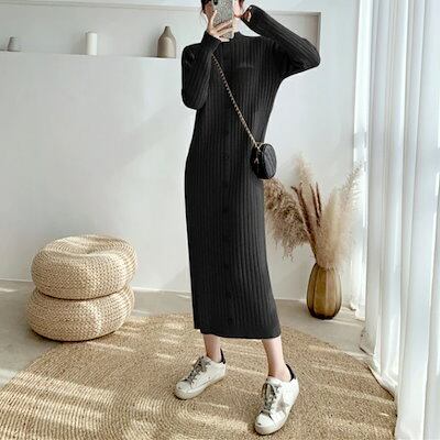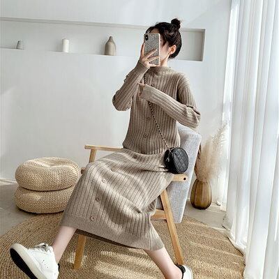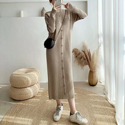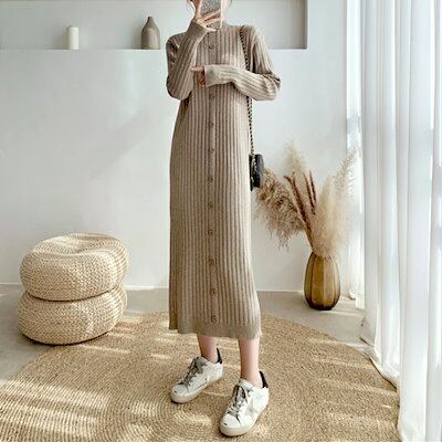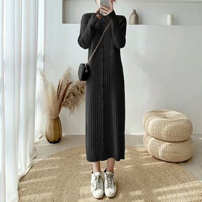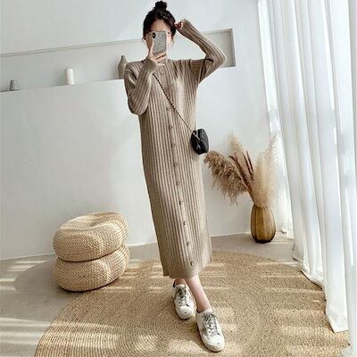 ワンピース ワンピ ドレス ニット 袖あり ハイネック リブ レディース エレガント きれいめ カジュアル 長袖 大人 可愛い フェミニン ミモレ丈 ボタン Iライン シンプル ベージュ ブラック 黒 | koookooo