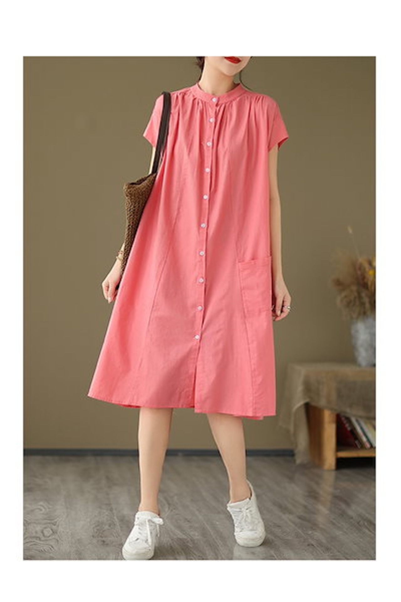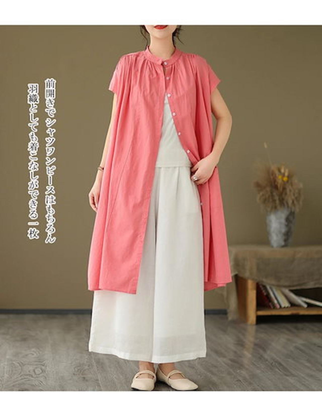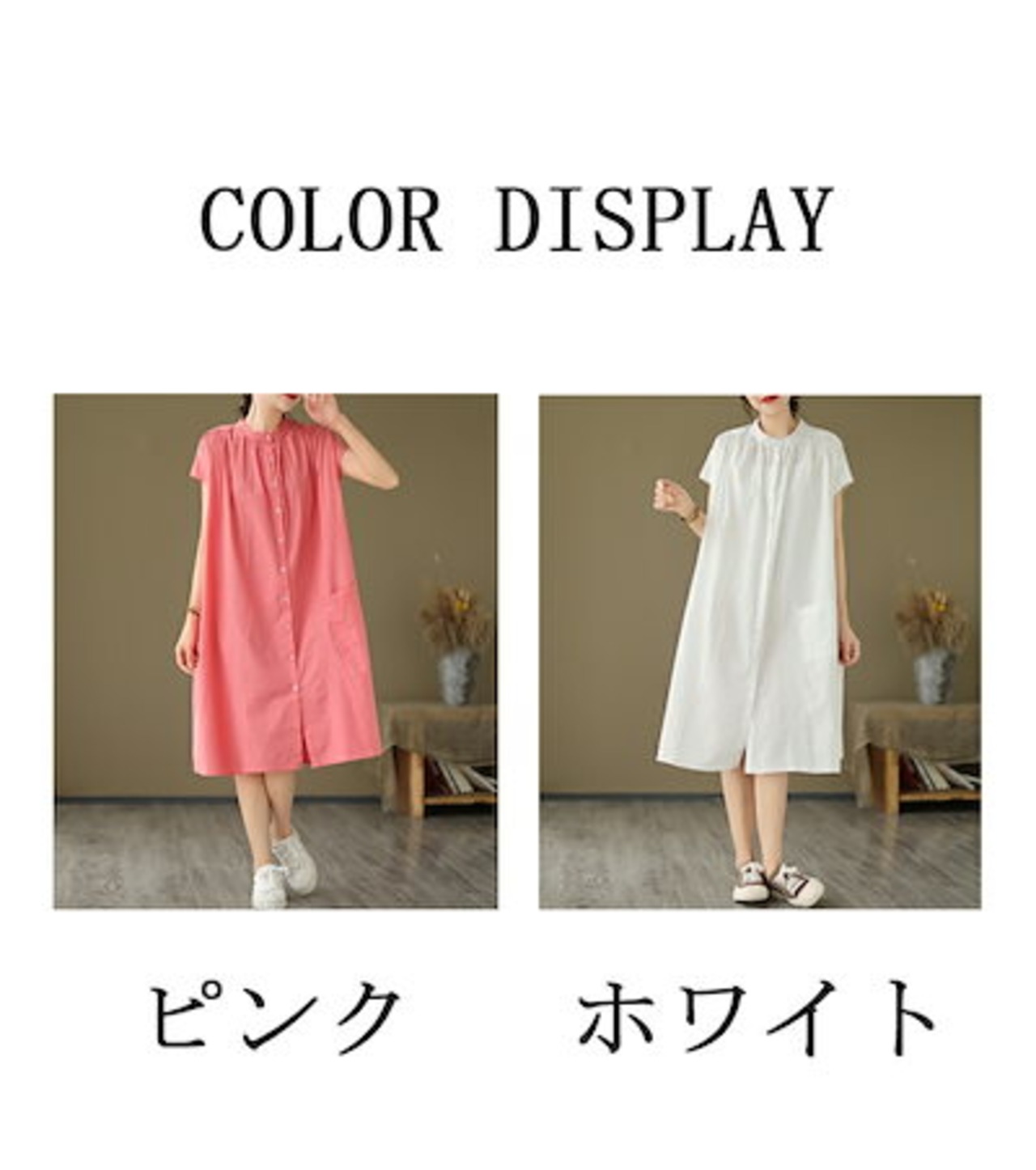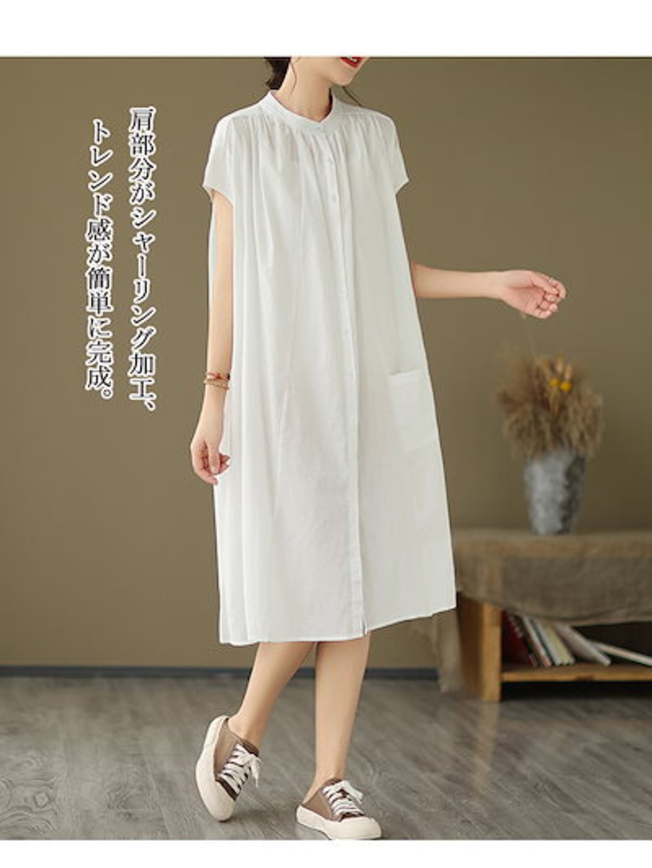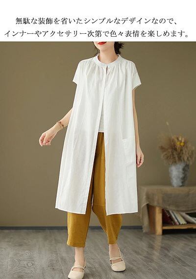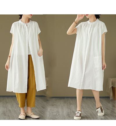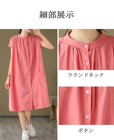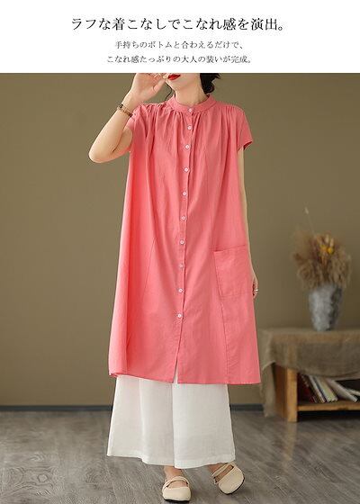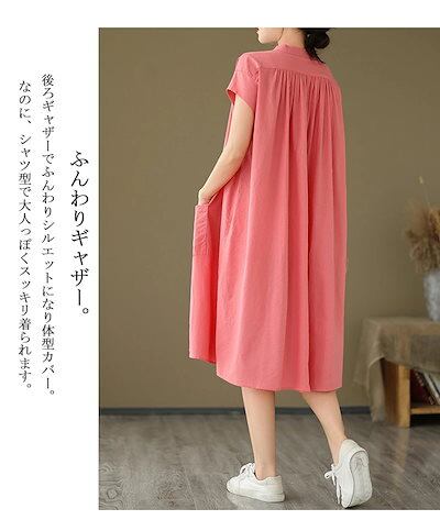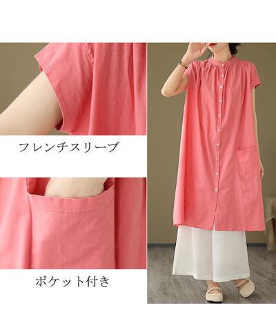 シャツワンピース フレンチスリーブ ワンピース レディース 夏 ロングワンピース ギャザー タック スタンドカラー ボタン 前開き ポケット付き Aライン ワンピ ロング丈 ミモレ丈 ゆったり 大きい | koookooo