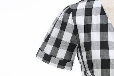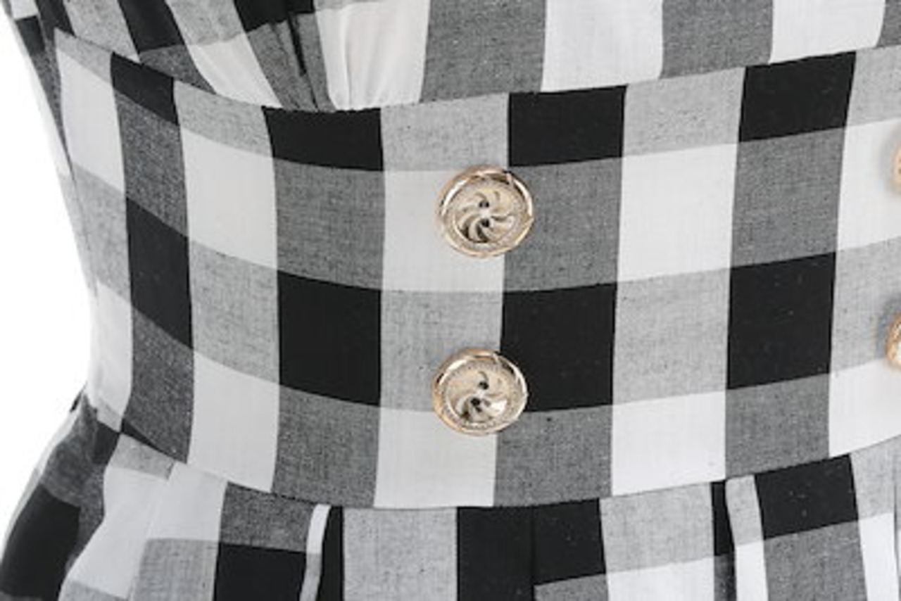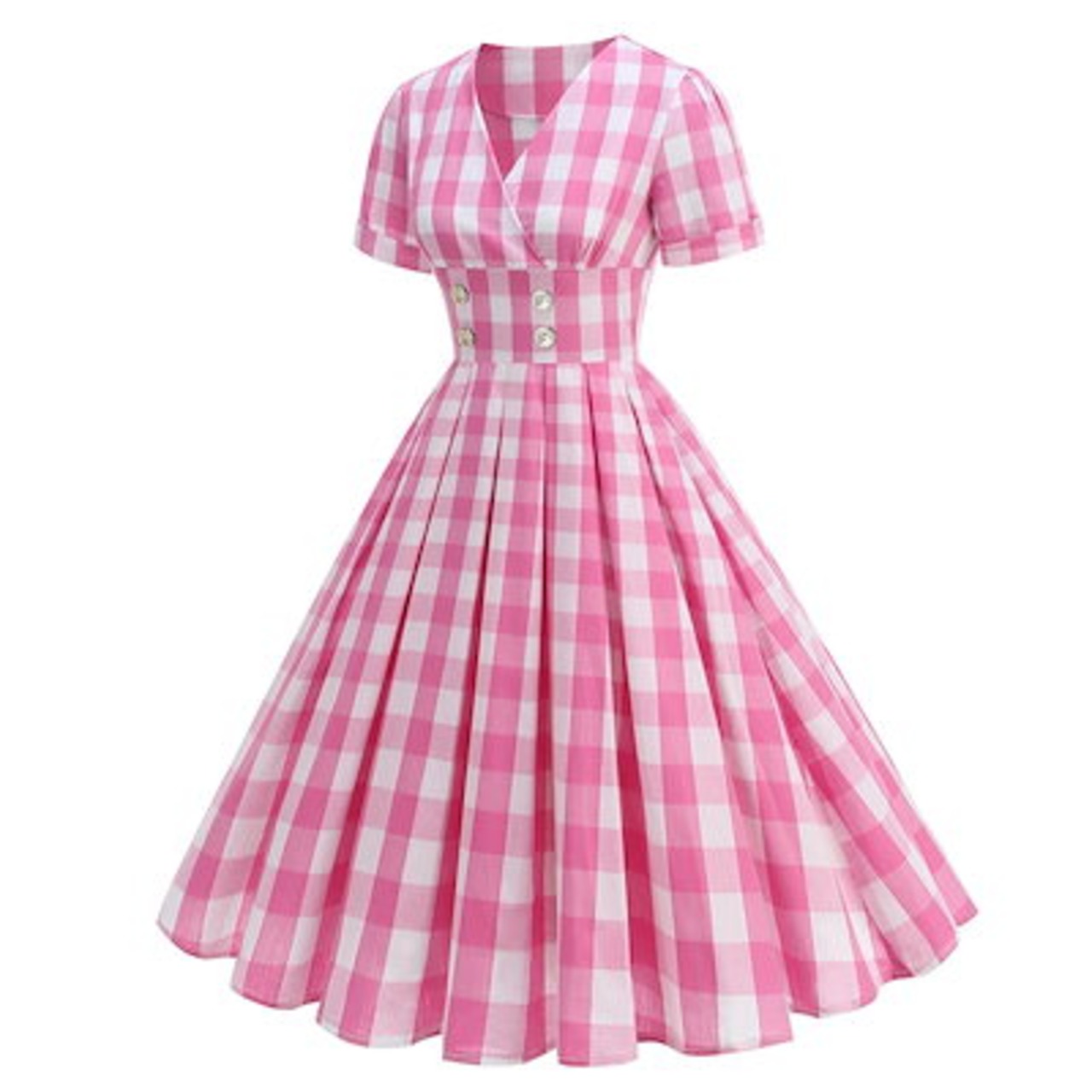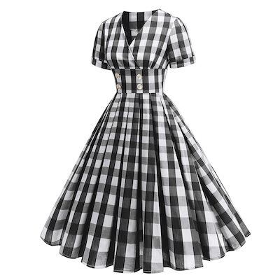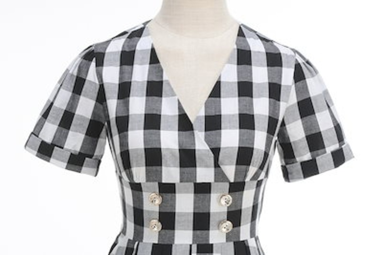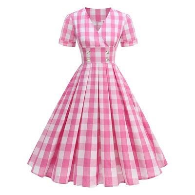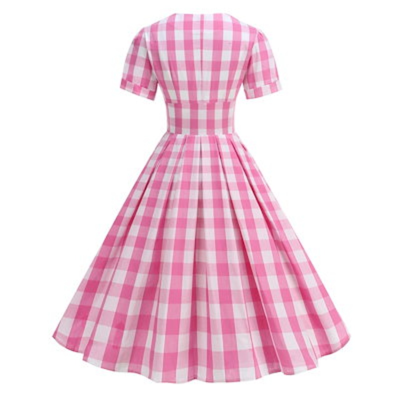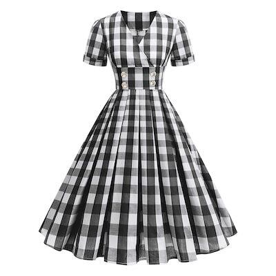ワンピース レディース レトロドレス 50年代 60年代 ロカビリー 綿 ギンガムチェック Aライン Vネック 半袖 ハイウエスト ボタン 膝丈 スイングワンピ お呼ばれ 結婚式 | koookooo