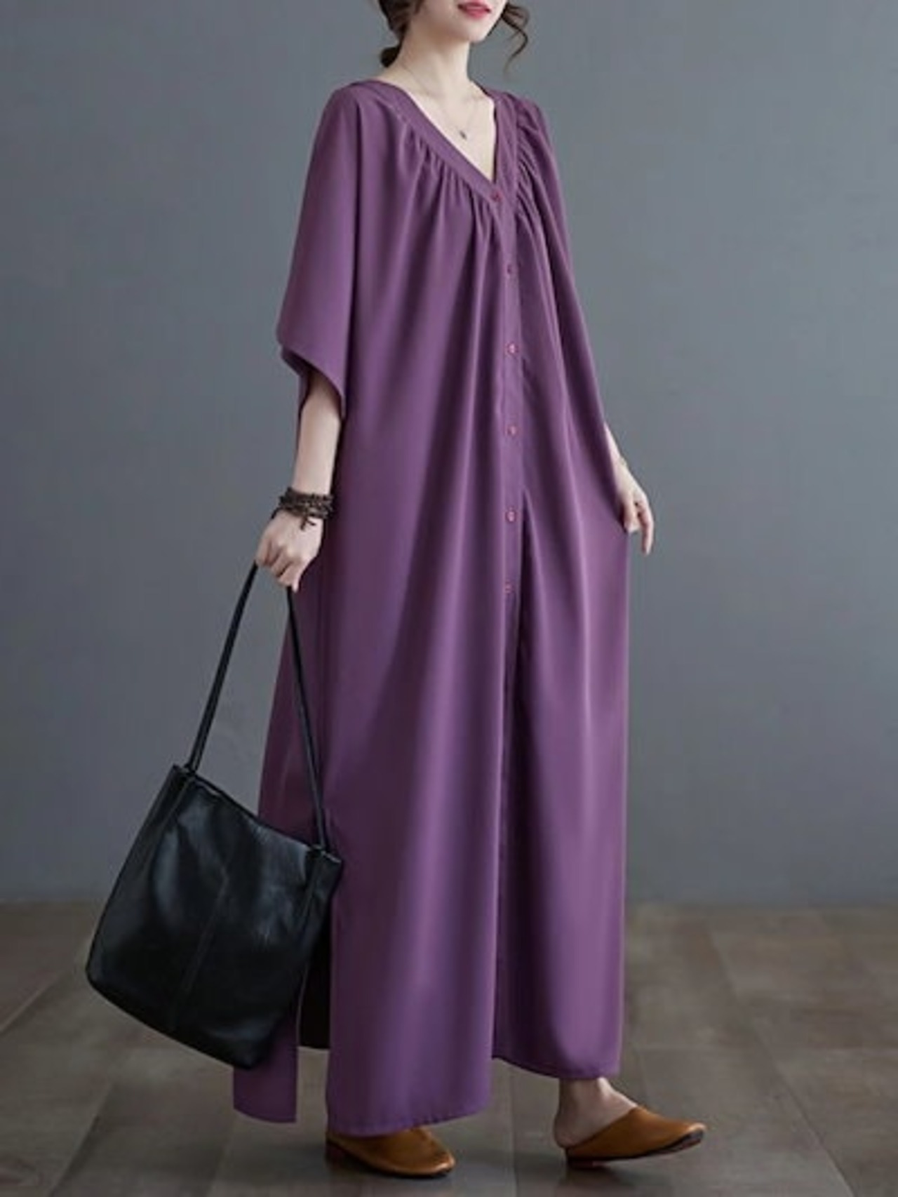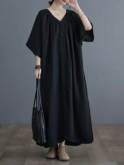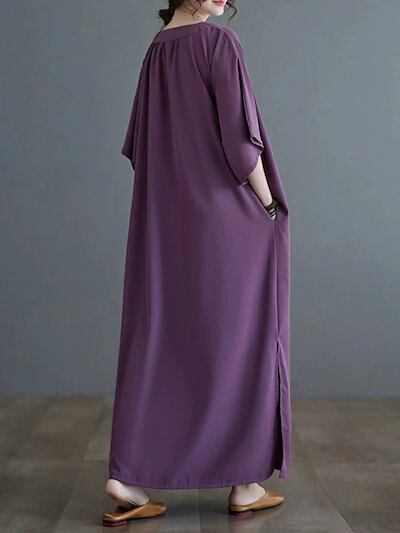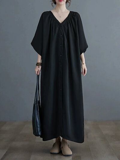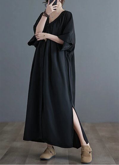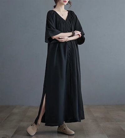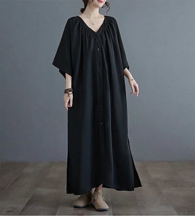 シャツワンピース 半袖 ロング プリーツ 無地 バンドカラー フレンチスリーブ フレア ワンピース シャツ レディース Vネック スリット フロントボタン 体型カバー サイドポケット シャツワンピ 肩 | koookooo