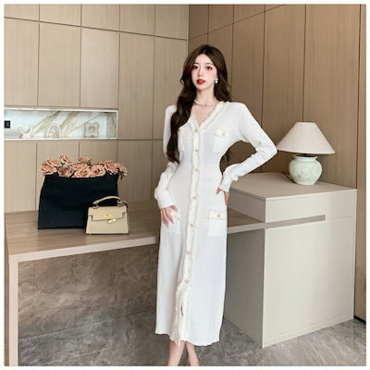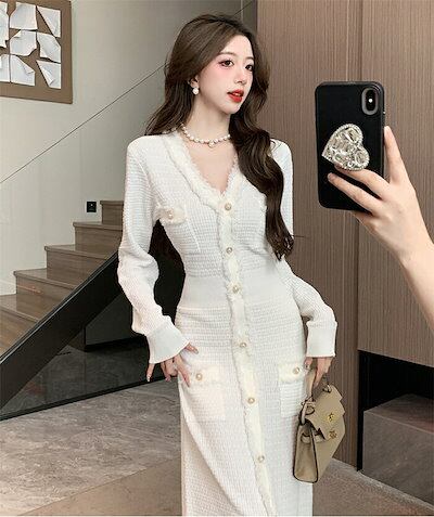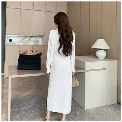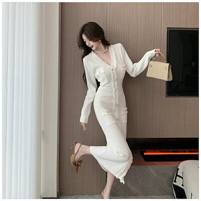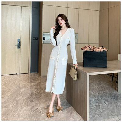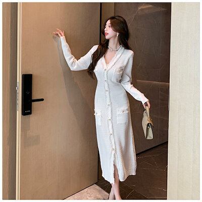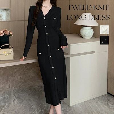 ワンピース ニット 秋 冬 春 長袖 ロング きれいめ レディース ロングワンピース ツイードワンピース ツイード 黒 白 Vネック スレンダーライン ゴールドボタン ロング丈 ミモレ丈 フォーマルワ | koookooo