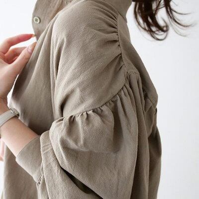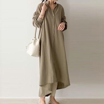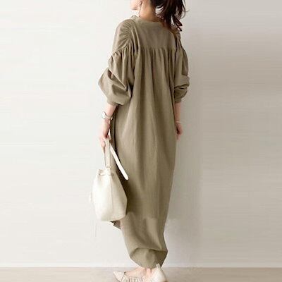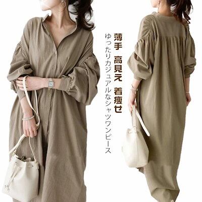 ワンピース レディース 長袖 ロングワンピース ロング ぽわん袖 ボタン開き シャツワンピース 韓国 体型カバー 薄手 高見え 着痩せ 大きいサイズ 膝下 aライン ガジュマル ひざ下丈 快適 Vネッ | koookooo