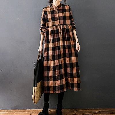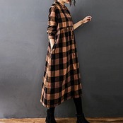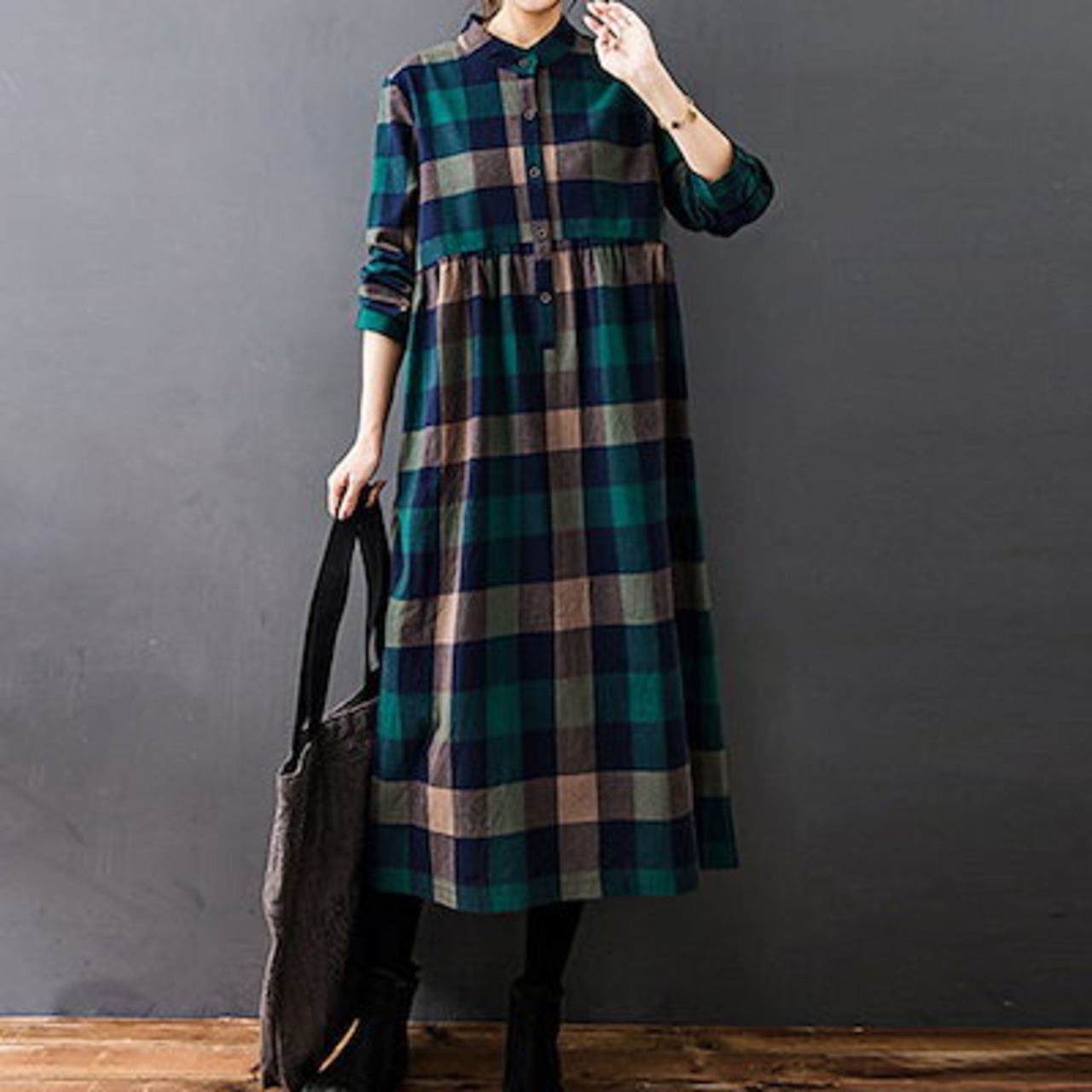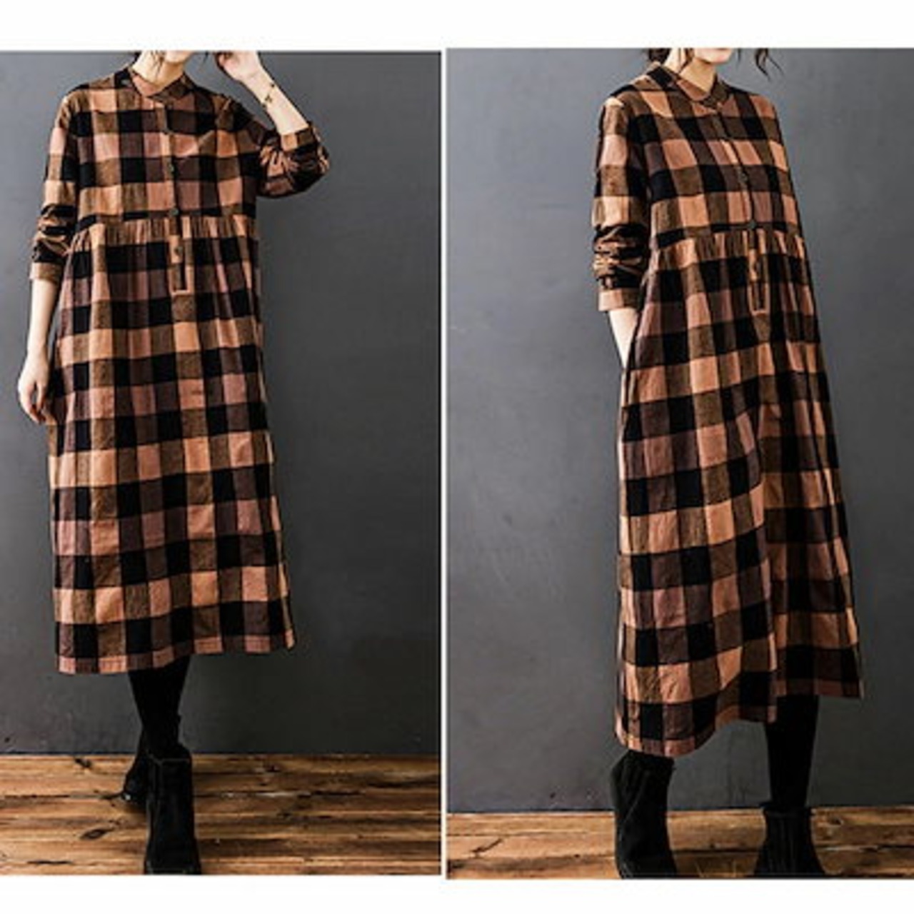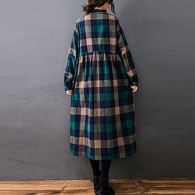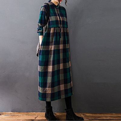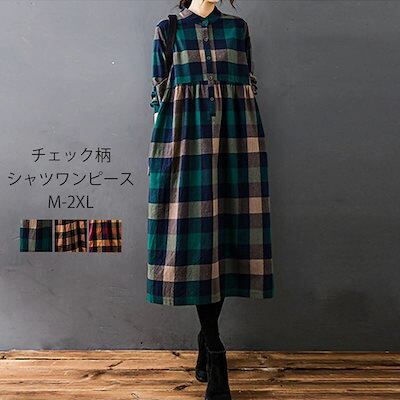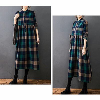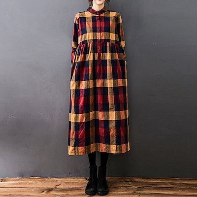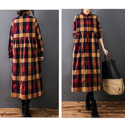シャツワンピース チェック 秋冬 ロングワンピース 長袖 ワンピース レディース きれいめ ワンピ シャツワンピ ロング チェック柄 秋 冬 立ち襟 ハーフボタン ポケット付き ロングシャツ カジュア | koookooo