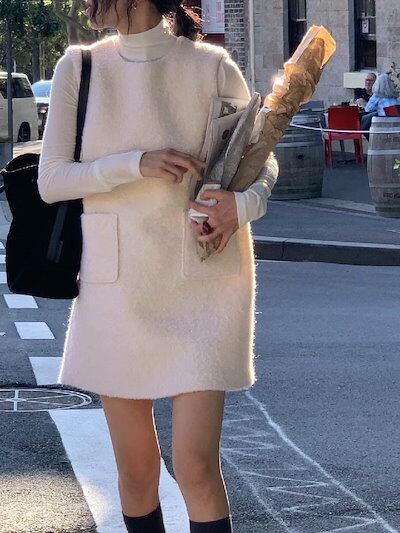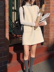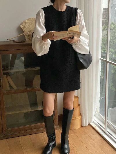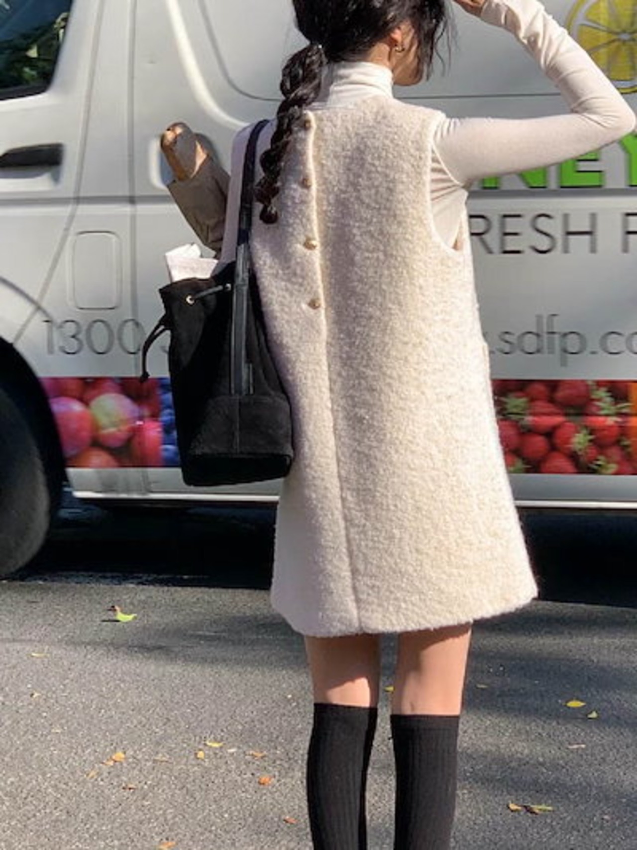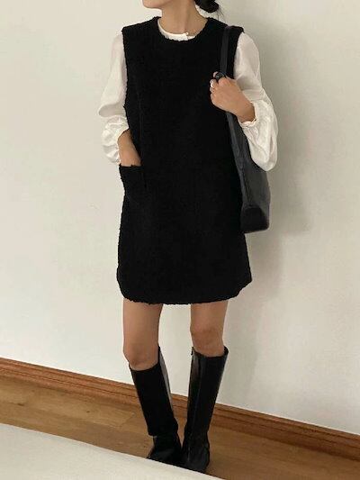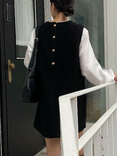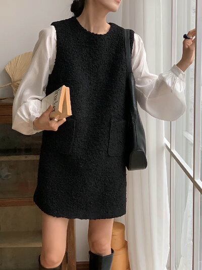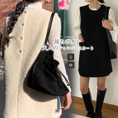 ワンピース 春 秋 レディース ツイード調 後ろボタン Aライン ジャンパースカート 膝丈 ジャンスカ ワンピース ノースリーブ 重ね着 レイヤード 無地 体型カバー 可愛い 大きいサイズ おしゃれ | koookooo