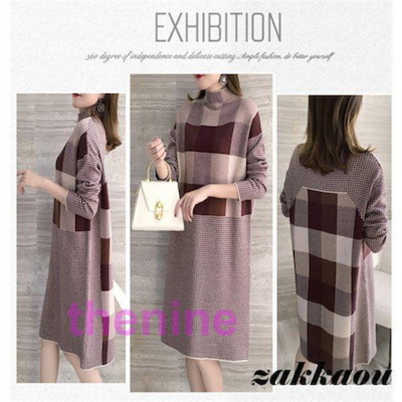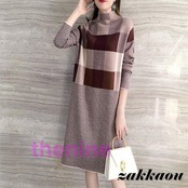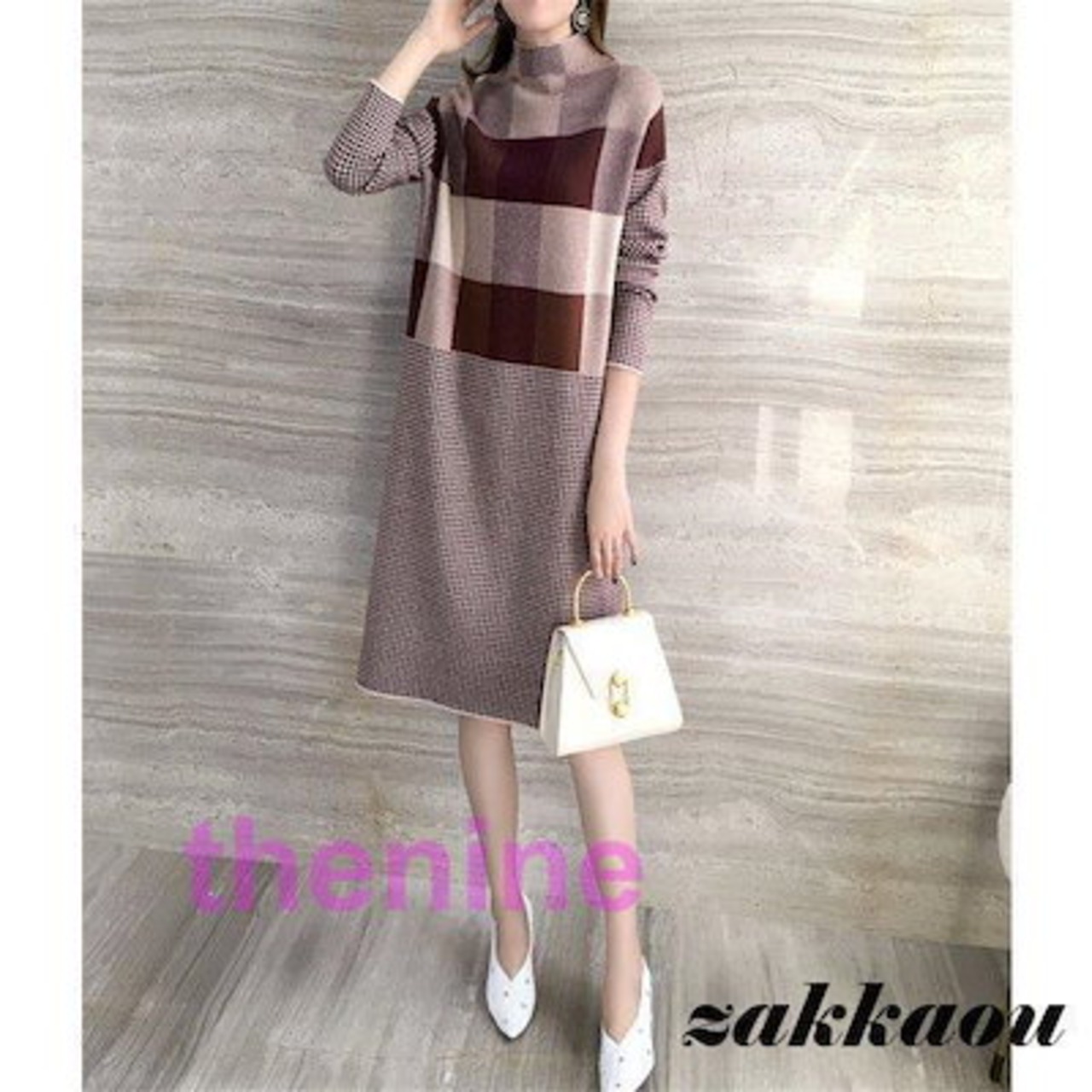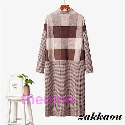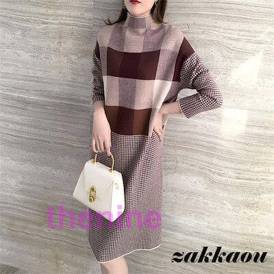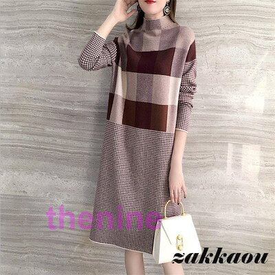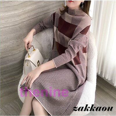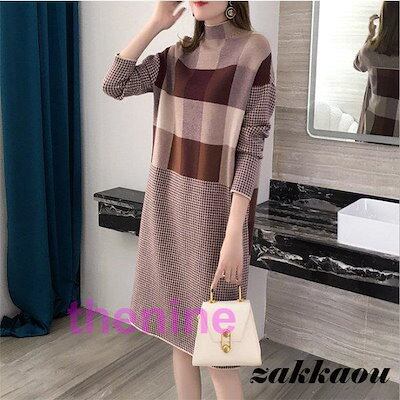 ニットワンピース チェックワンピース 長袖 体型カバー レディース 膝丈 着痩せ ひざ丈 ニット 切り替え 大きいサイズ ック 秋 冬 上品 30代 40代 50代 ギフトポ