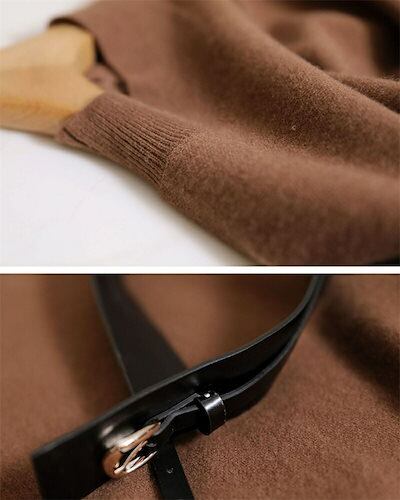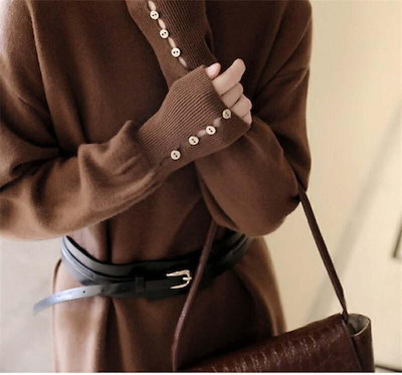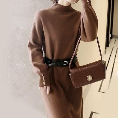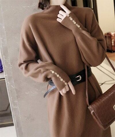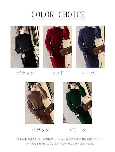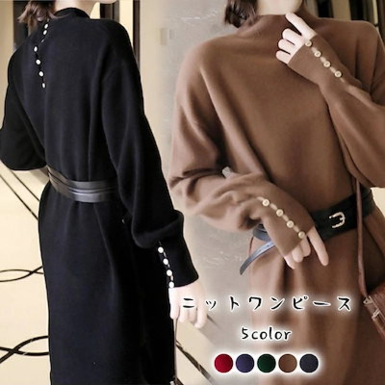 ニットワンピース レディース ニットワンピ タイトワンピース ニット ワンピ ワンピース セーター ボタン タートルネック ハイネック ベルト付き 長袖 ひざ丈 膝丈 デザイン 秋 冬 秋冬 通勤 フ | koookooo