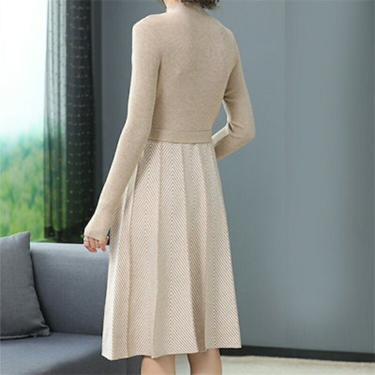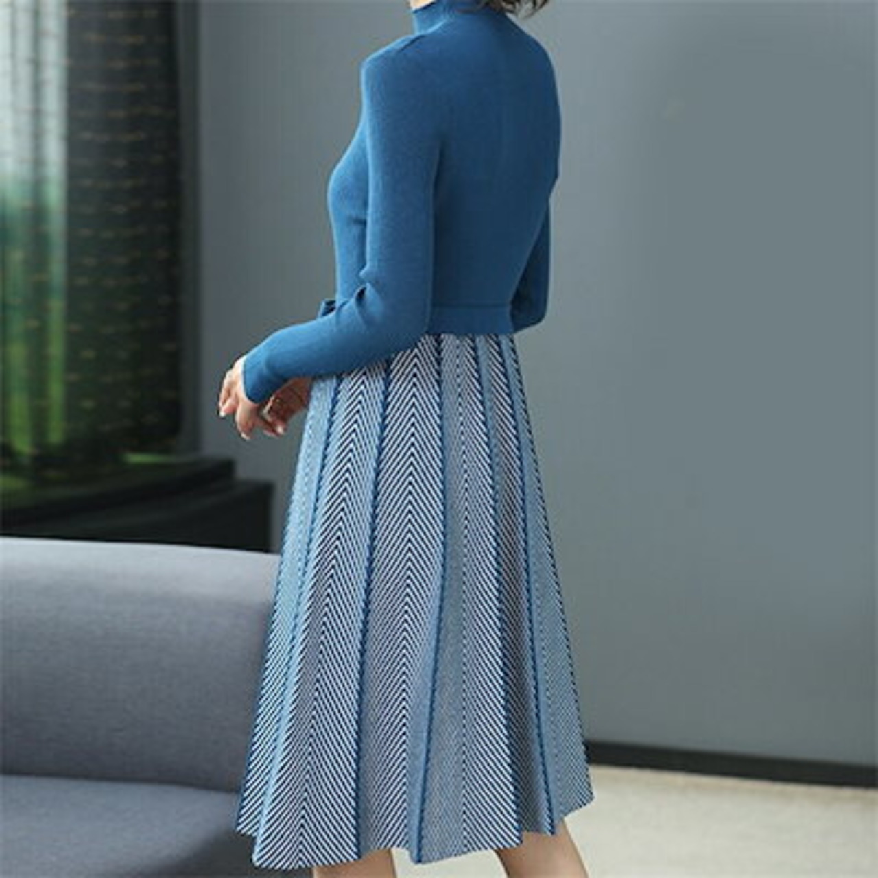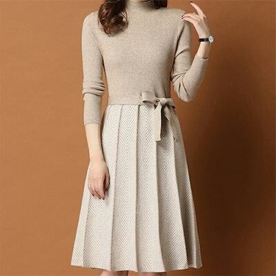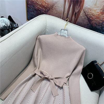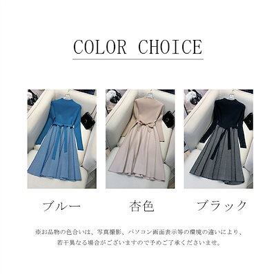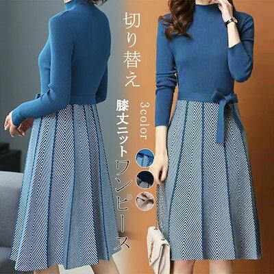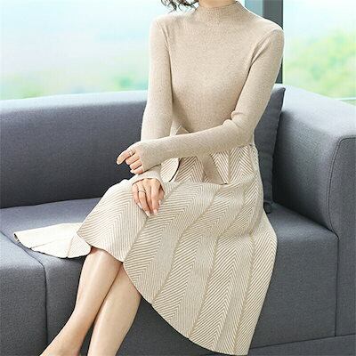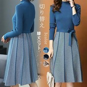 ニットワンピース ニット 秋冬 ワンピース フレアワンピース フレア aライン aラインワンピース 切り替え 異素材 レディース ワンピ セーター ボトルネック ハイネック ベルト付き 長袖 ひざ丈 | koookooo