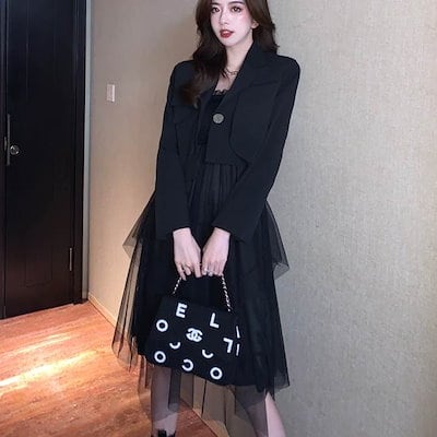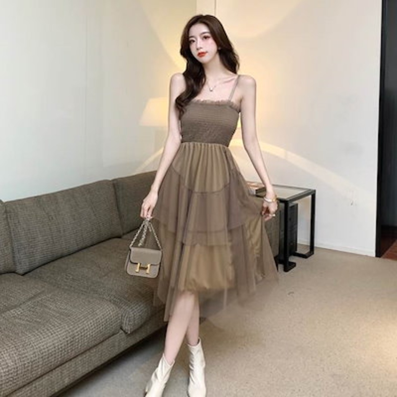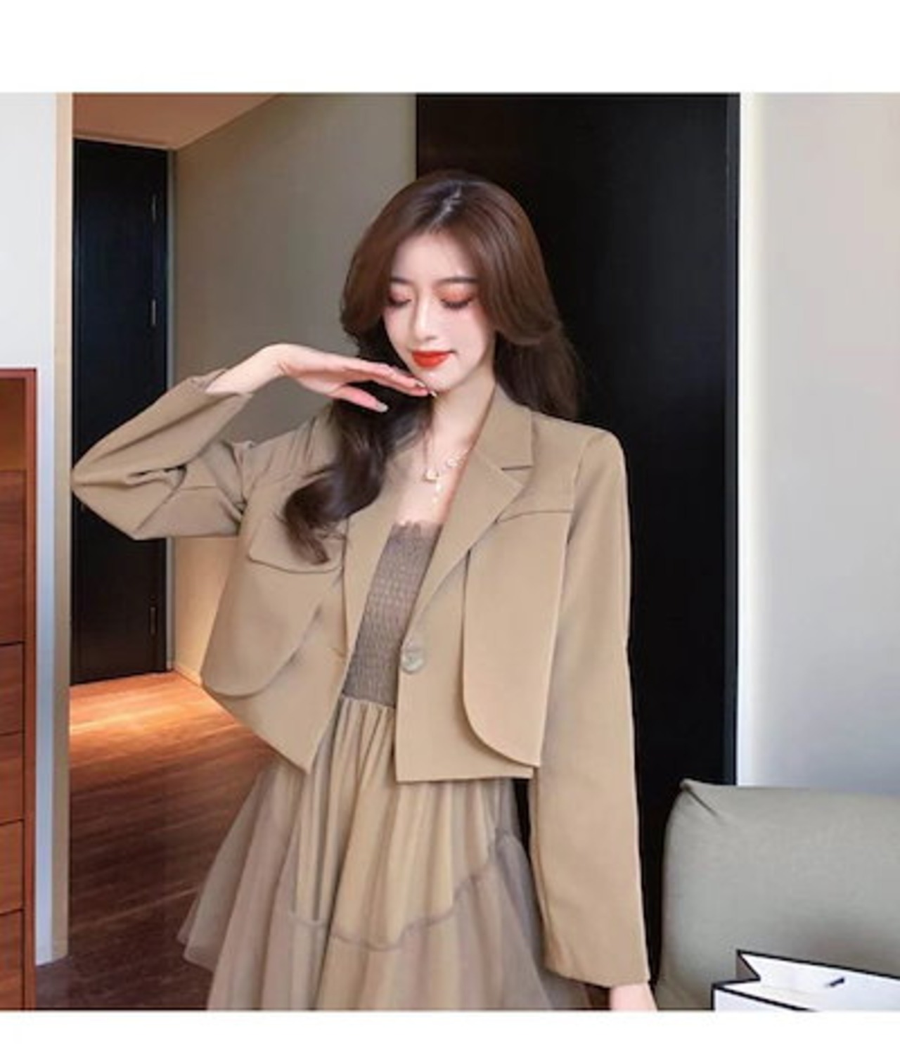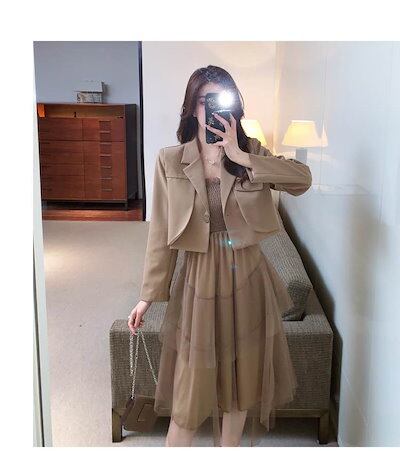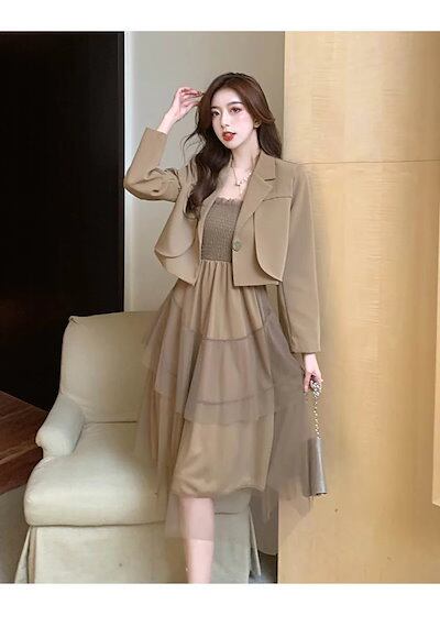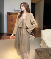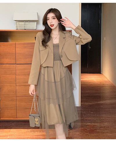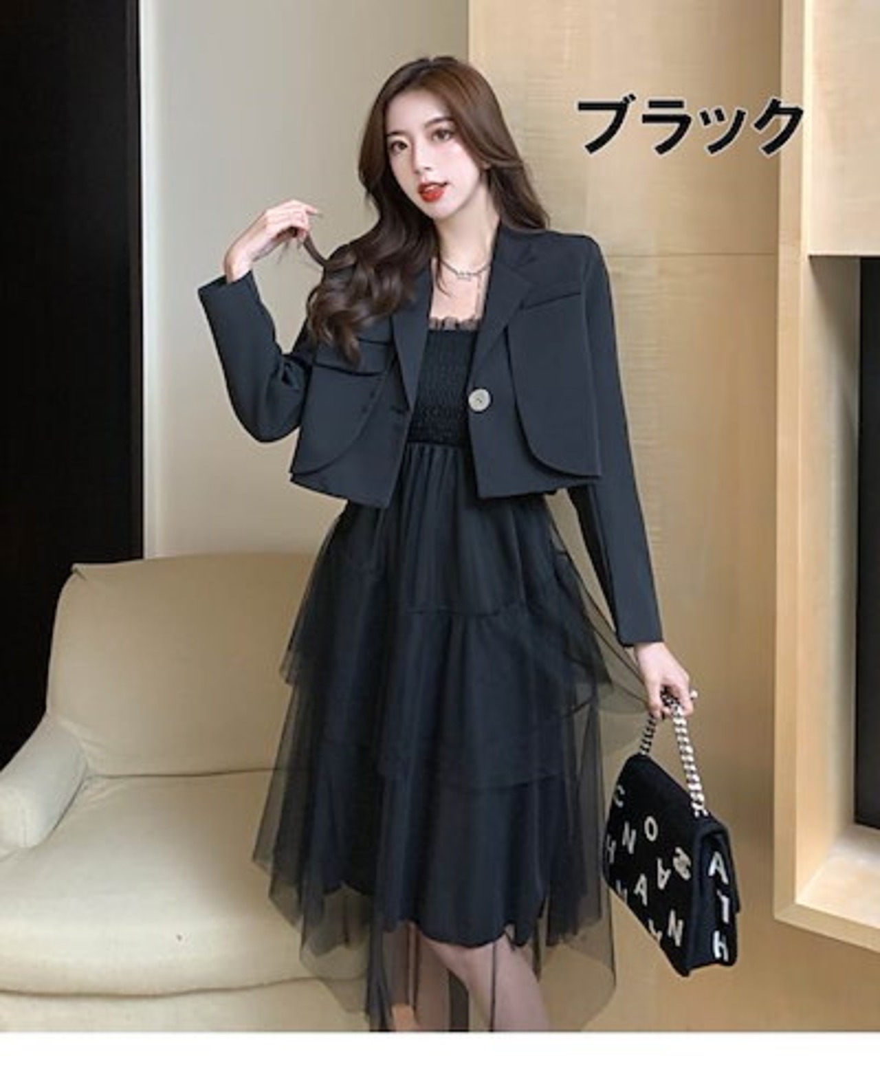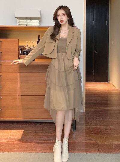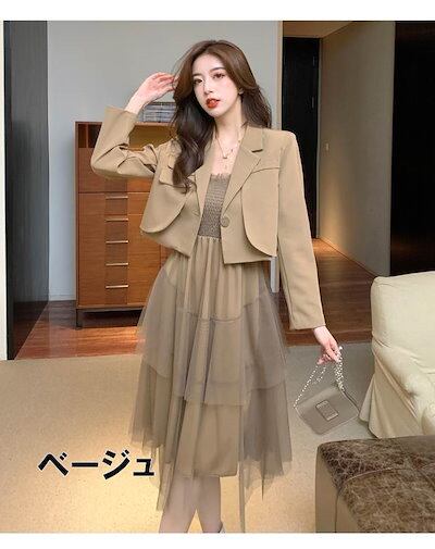 『目玉新商品』2色 セットアップなジャケット クロップ丈 長袖 レイヤード ショート ひざ丈 ワンピース レディース シャーリング ギャザー キャミワンピース チュール ティアード セクシー 大人可愛 | koookooo