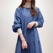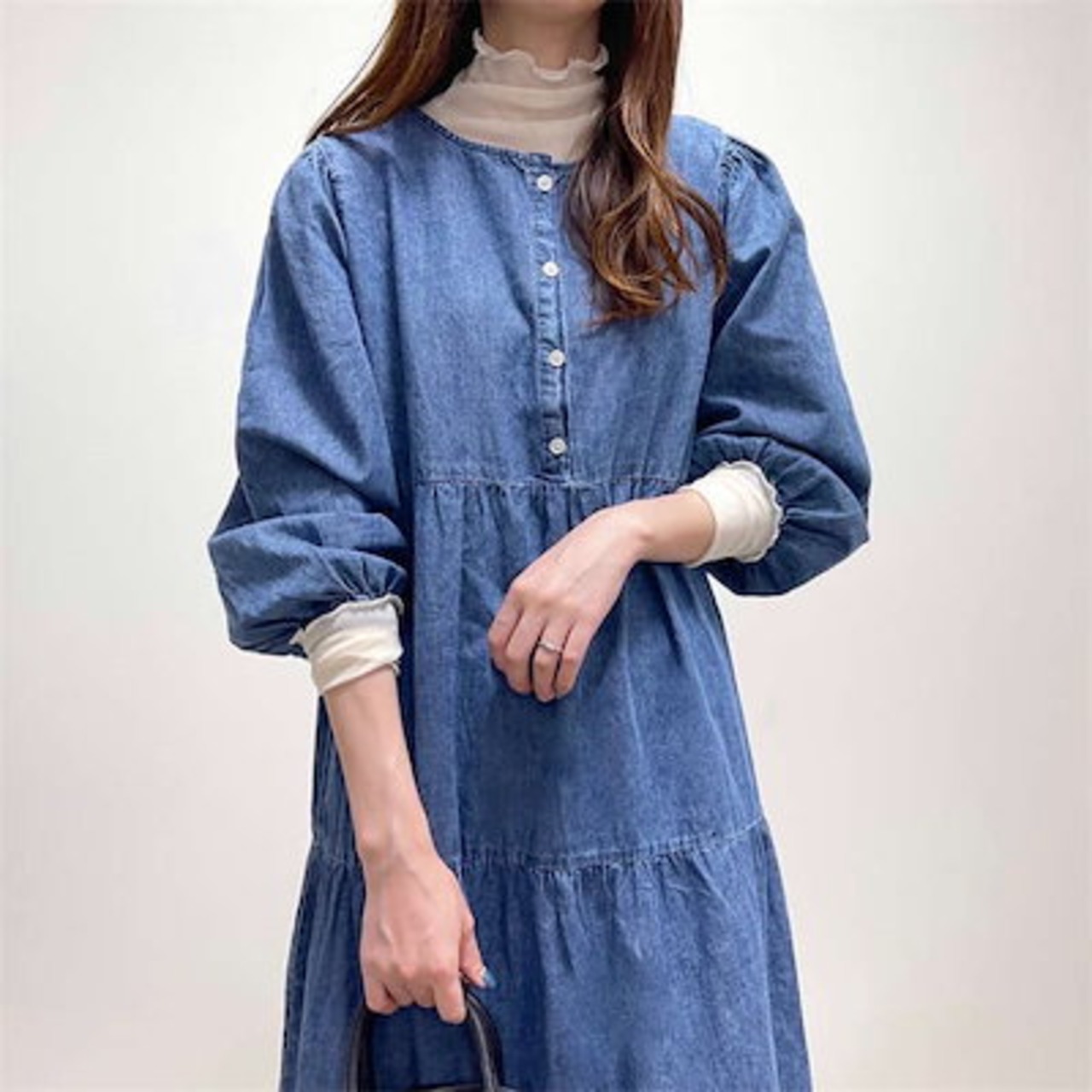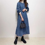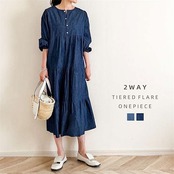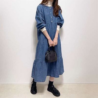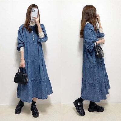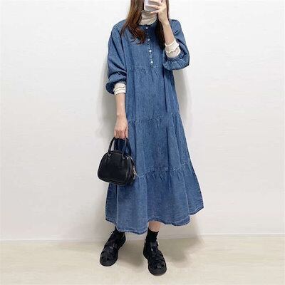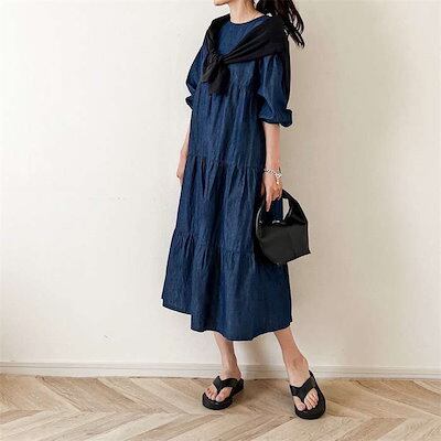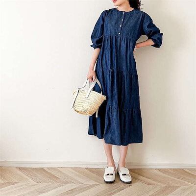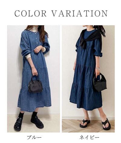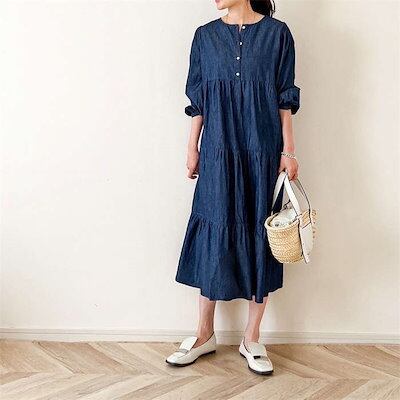 ティアードワンピース レディース ワンピース デニム ロング 七分袖 きれいめ ロングワンピ 秋 冬 春 Aライン 2WAY ミモレ丈 ロング丈 ひざ下 ゆったり 長袖ワンピ デニ ティアード | koookooo