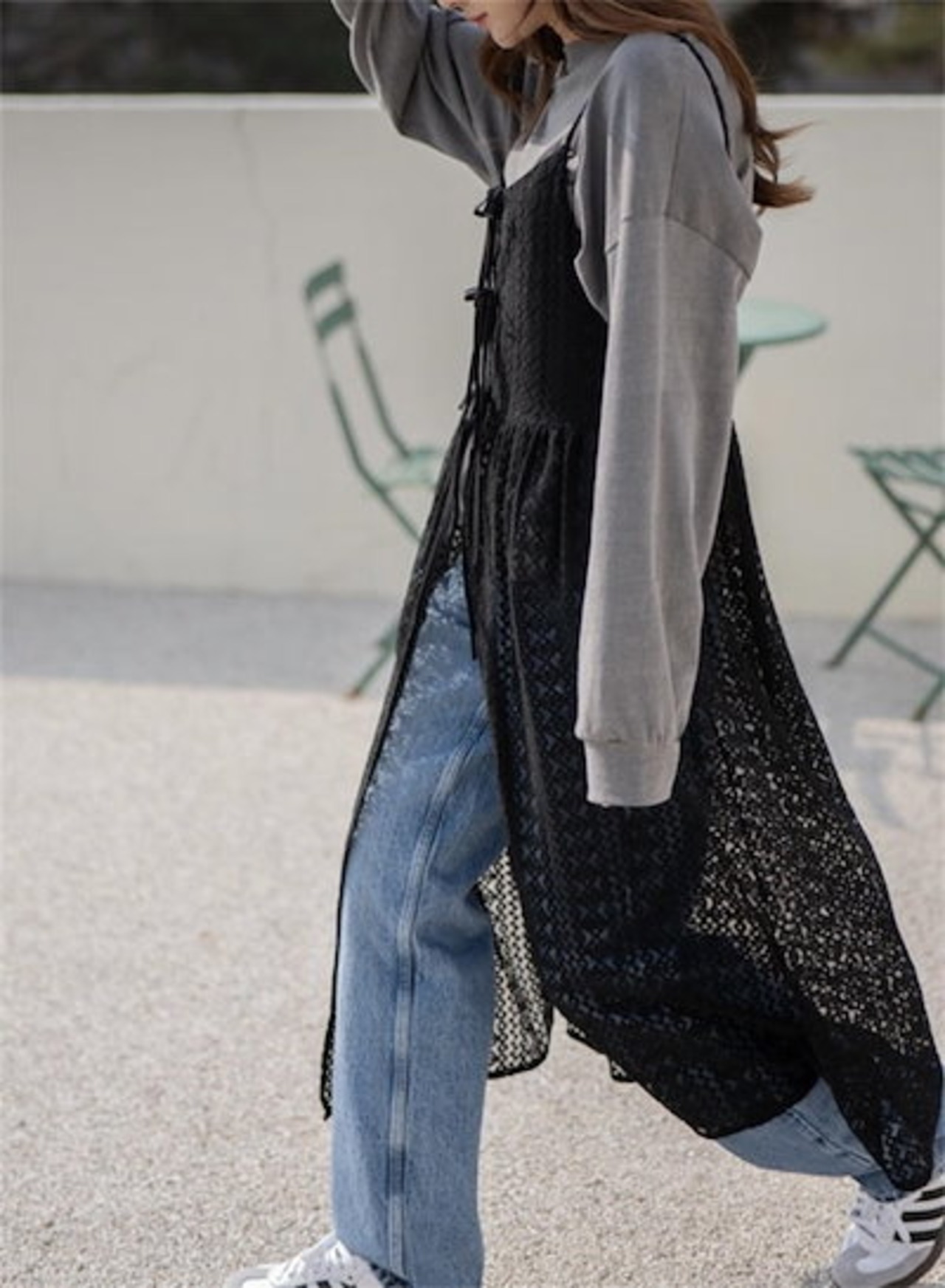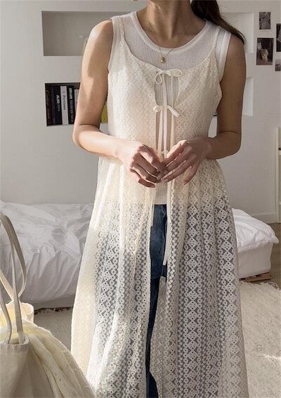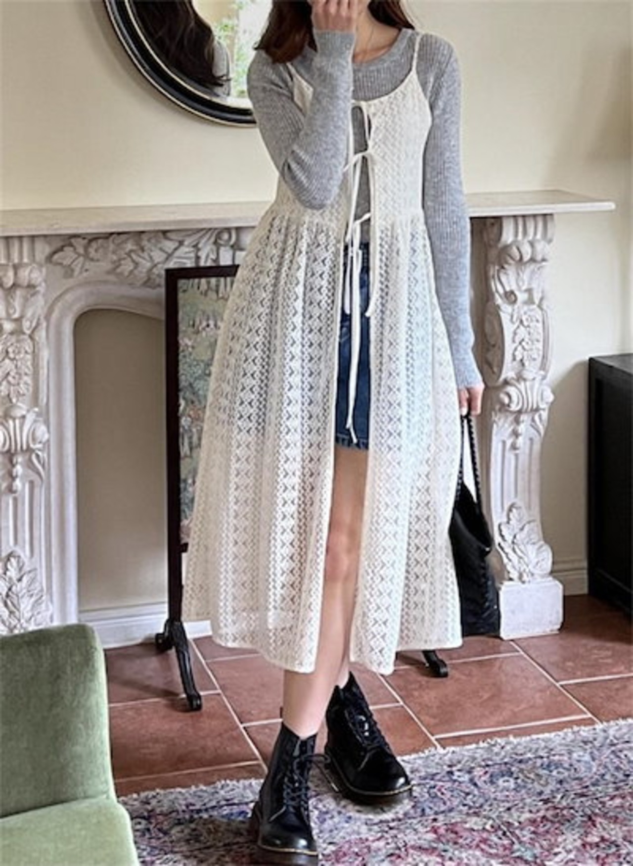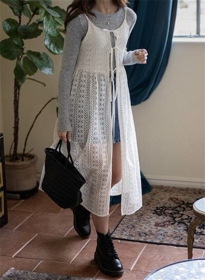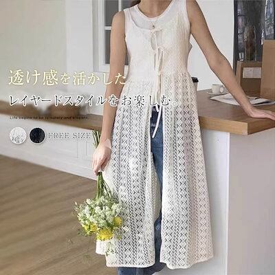 レイヤード レース キャミワンピース レディース 重ね着風 キャミソール ワンピース リボン付き レース ひざ丈 肌見せ 総レース レースワンピース インナーワンピース 薄手 シースルー 体型カバー | koookooo