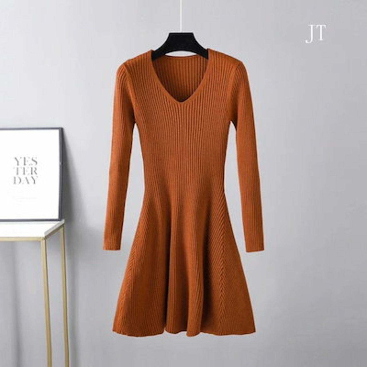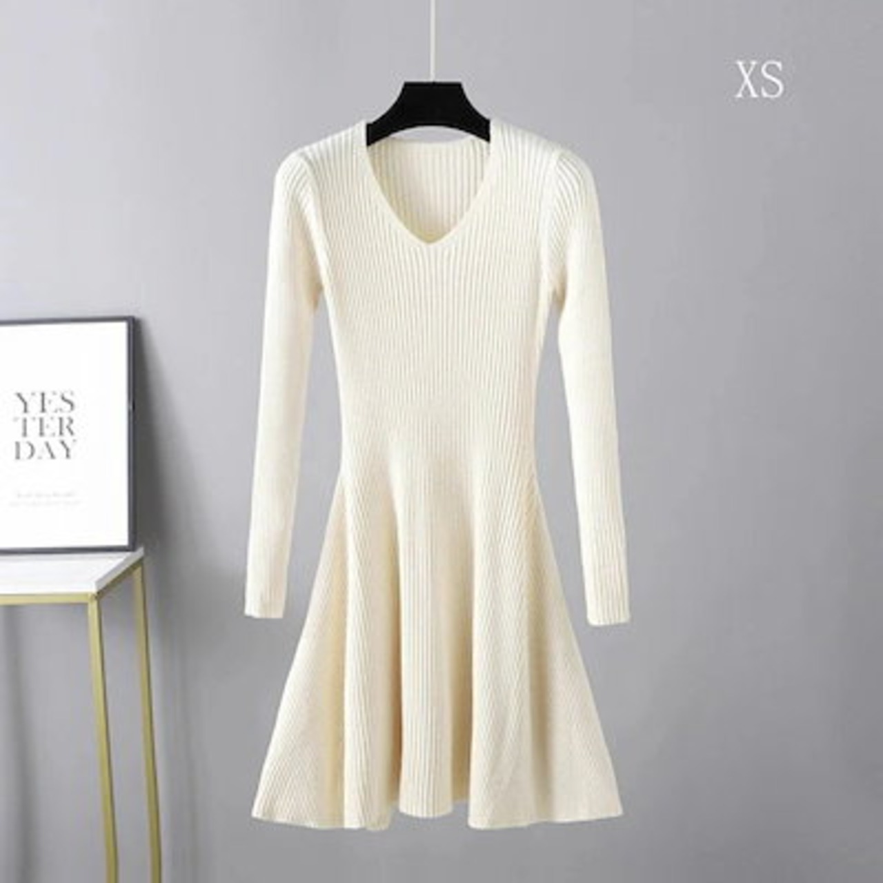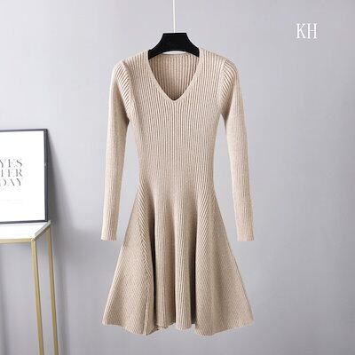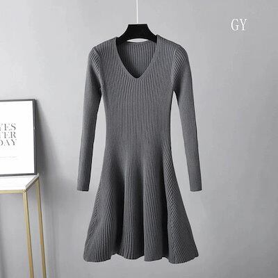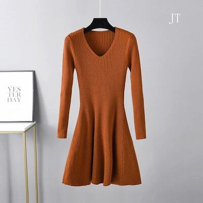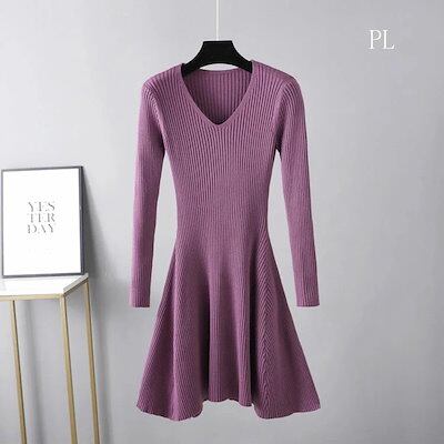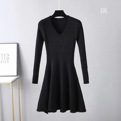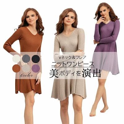 お早めに!ニットワンピース フレア レディース vネック Aライン 長袖 ひざ丈 秋冬 大きいサイズ ニットワンピ ミニ丈 インナー ストレッチ素材 ミモレ丈 きれいめ 結婚式 無地 膝丈 着痩せ効果 | koookooo