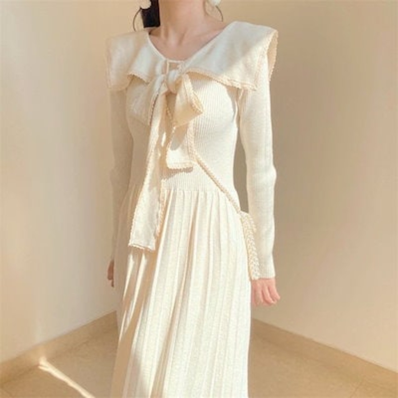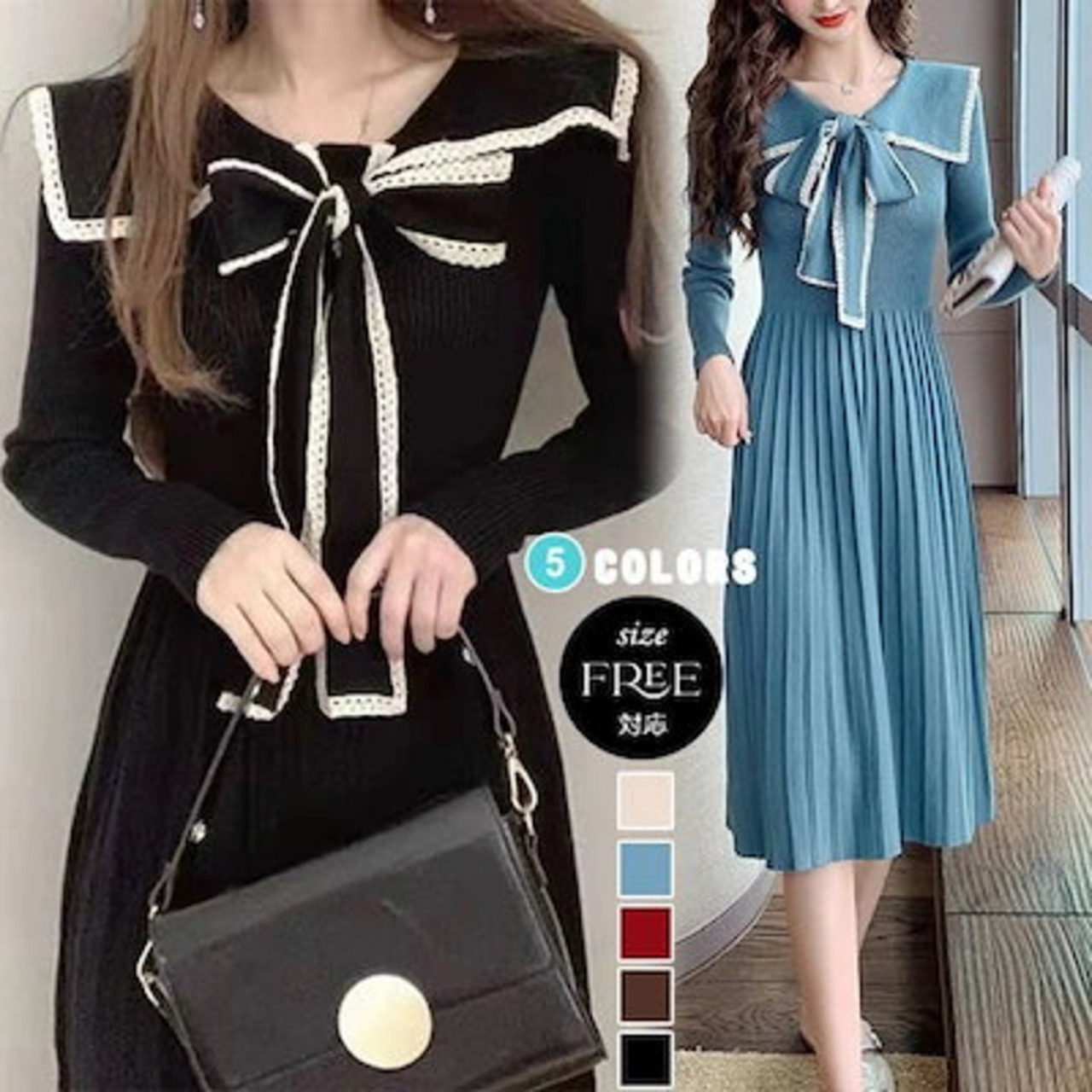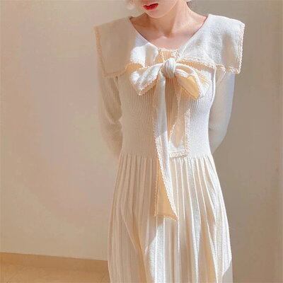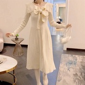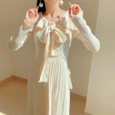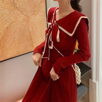 【3枚ご購入で200 OFF!】O 通勤 結婚式 ドレス プリーツスカート バイカラー ウエスト引き締め 秋冬 着痩せ 膝丈 レディース Aライン ひざ丈 ロングニットワンピース リボンスカー | koookooo