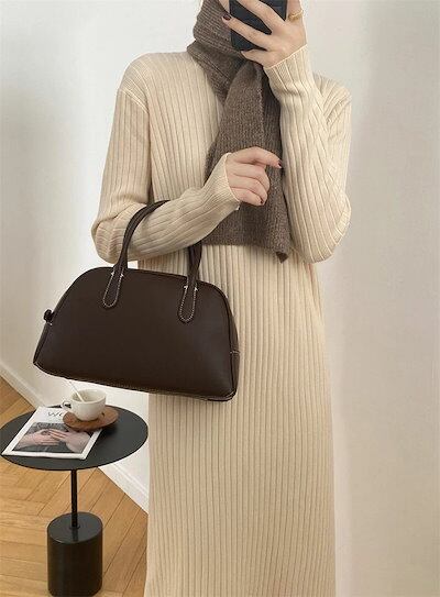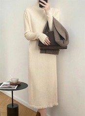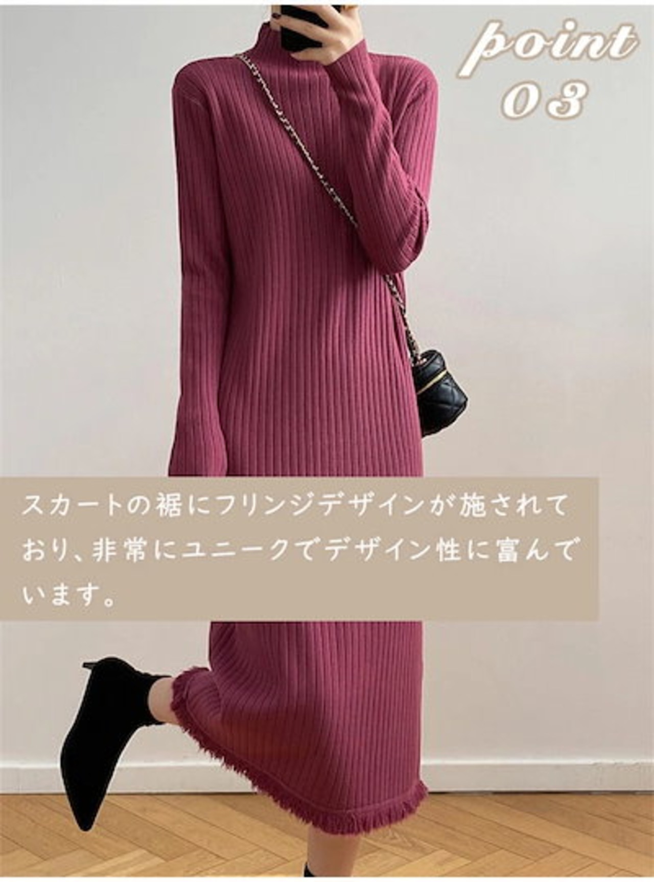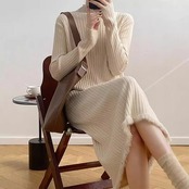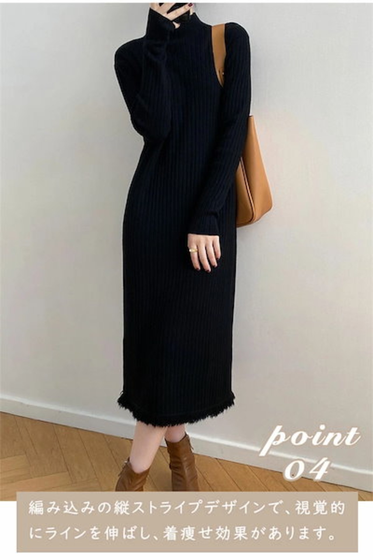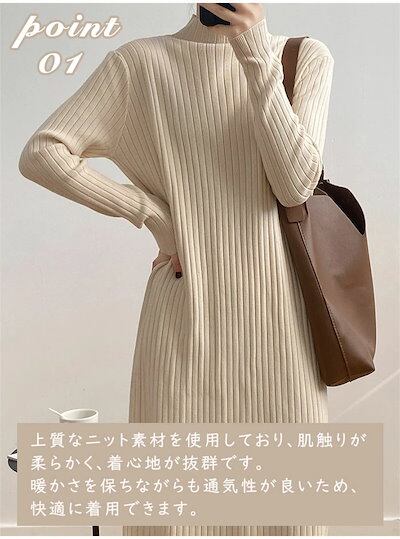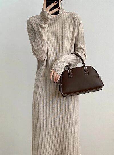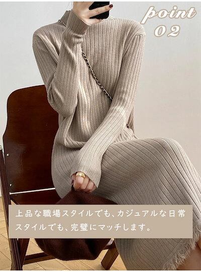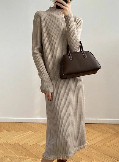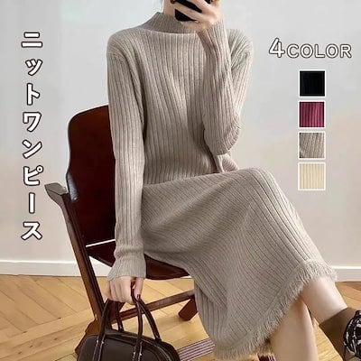 ニットワンピース レディース フリンジニットワンピース ハイネック ボトルネック リブニット ひざ下丈 リブ編み ロング丈 着痩せ 体型カバー 高見え マキシワンピース ニットセーターワンピース 無地 | koookooo