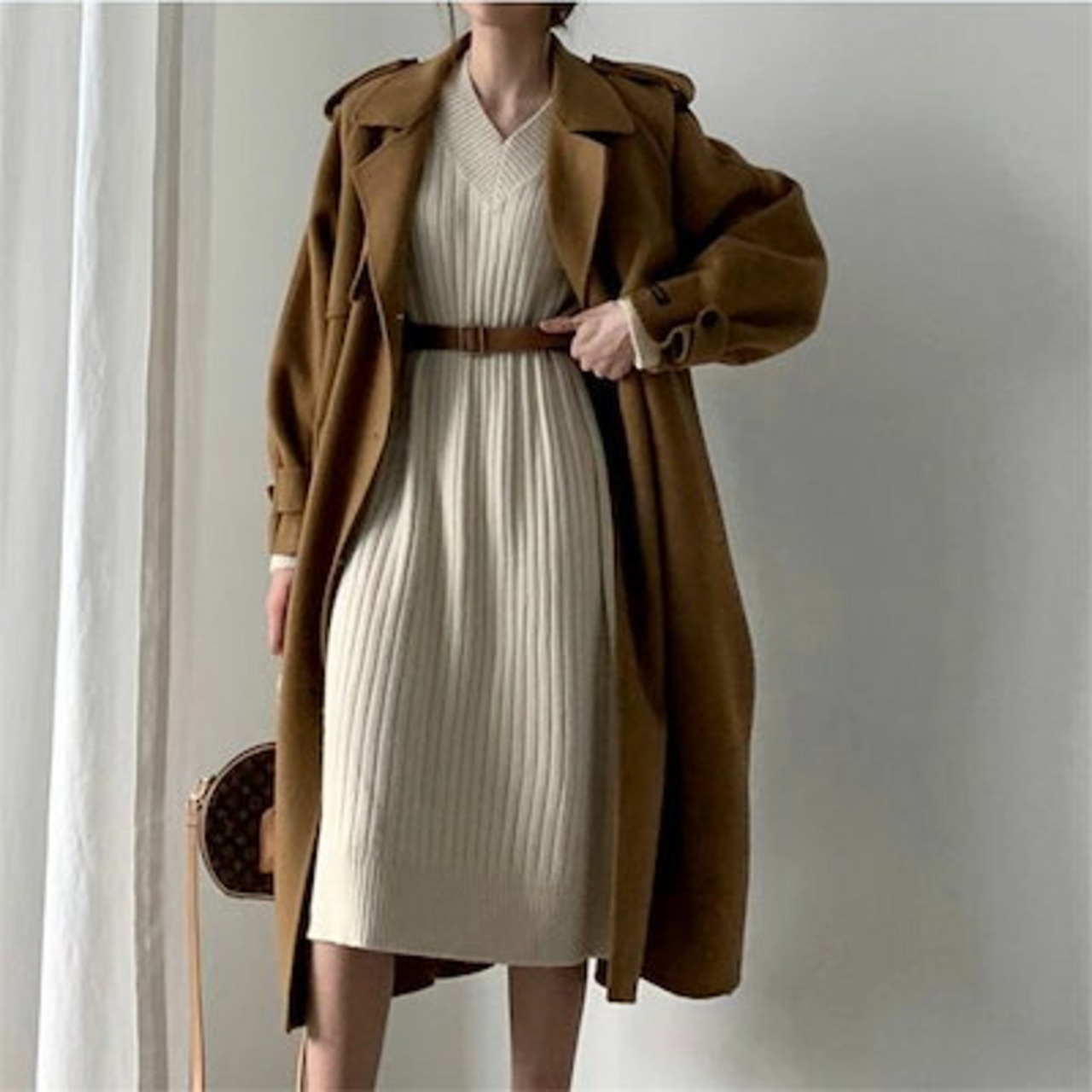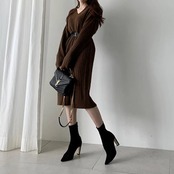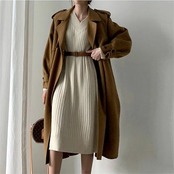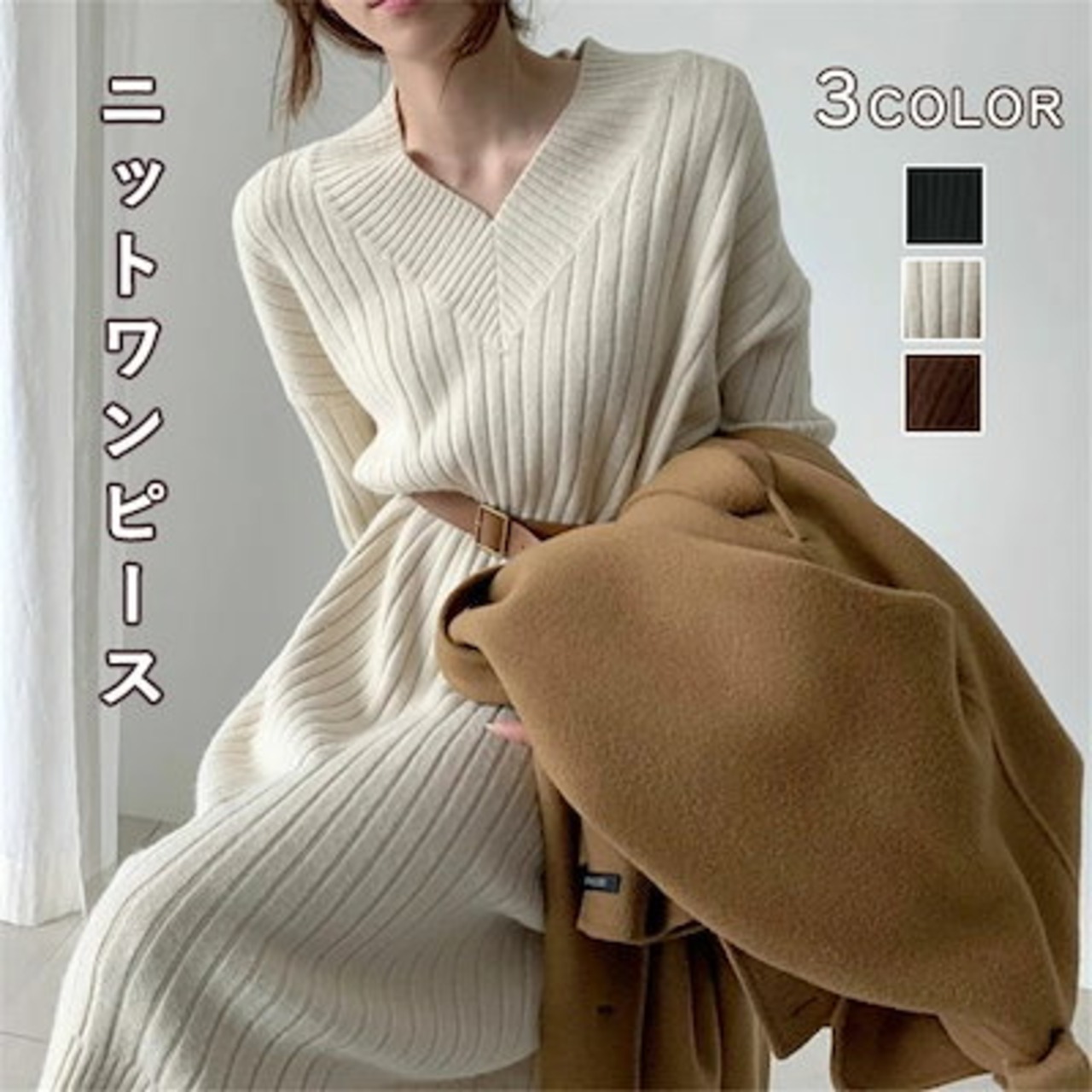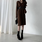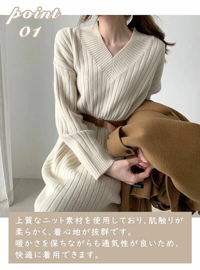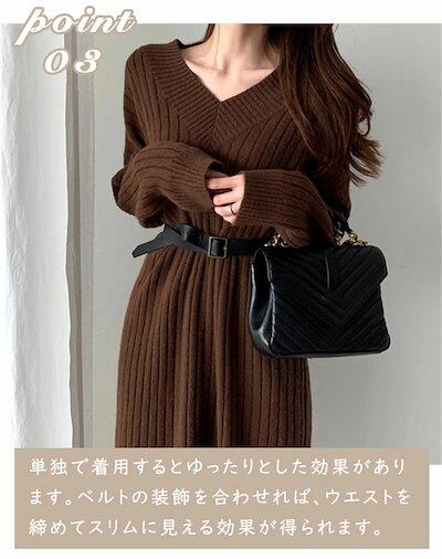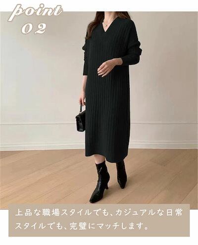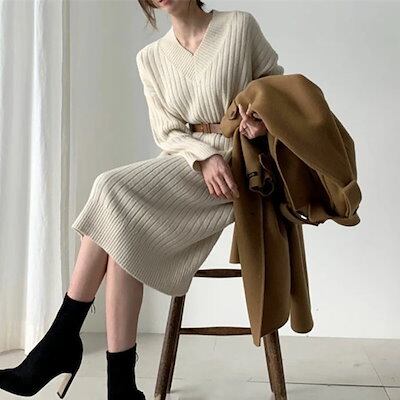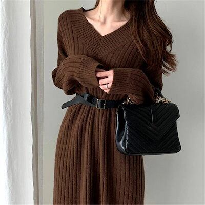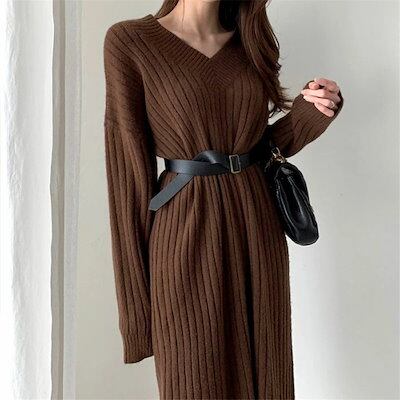 ニットワンピース レディース リブニット Vネック ベルト付き ゆったり ひざ下丈 体型カバー マキシワンピース ロング丈セーター 無地 カジュアル OL 上品 女性 大人 長袖 厚手 春秋冬 通勤 | koookooo