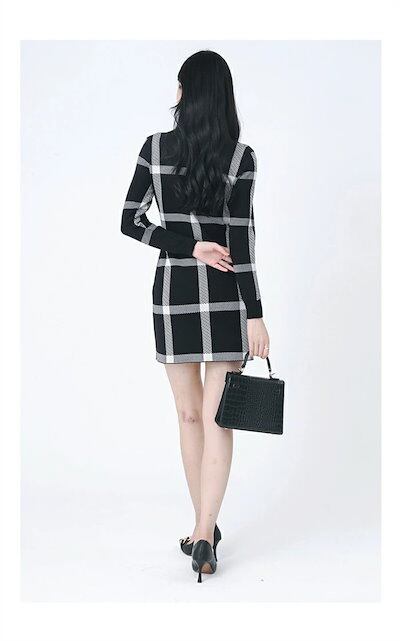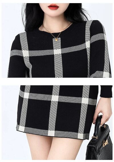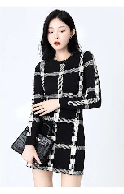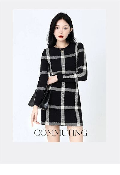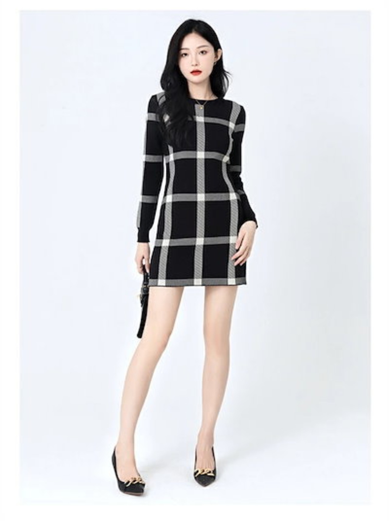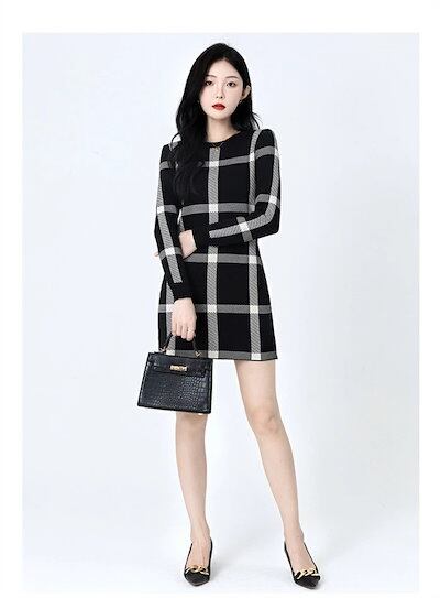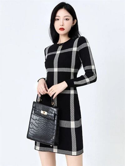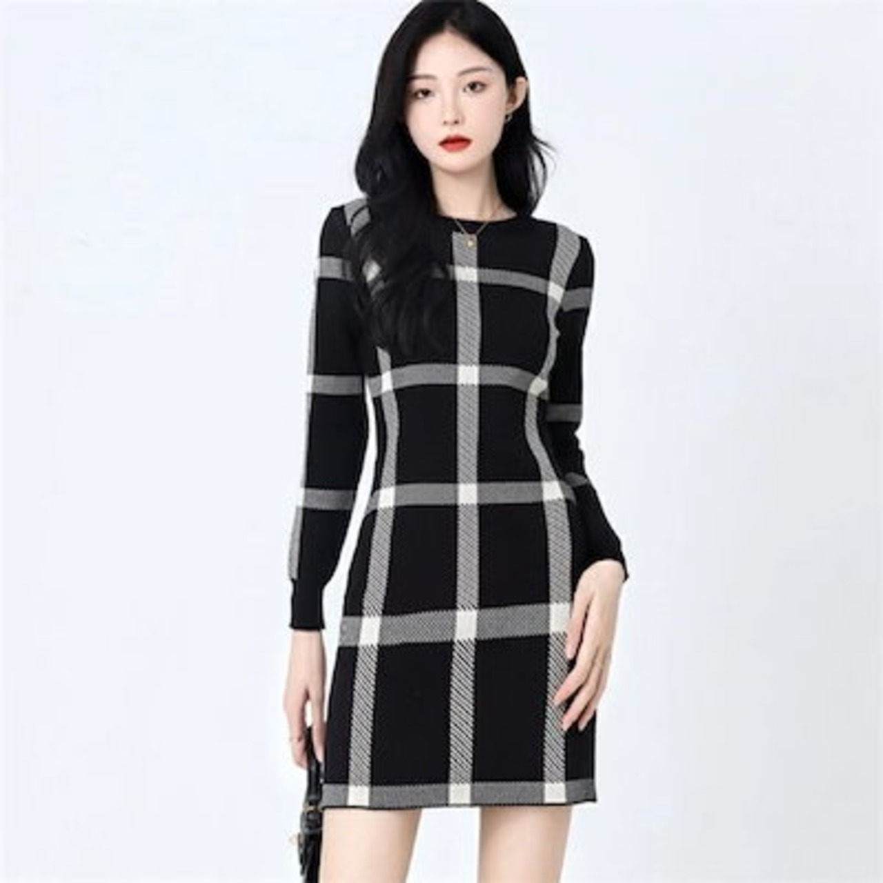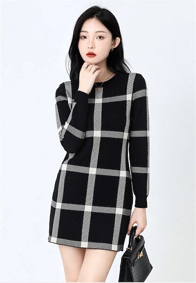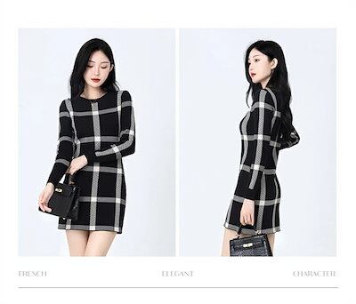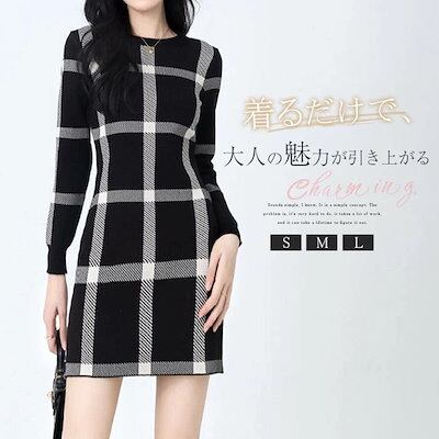 ニットワンピース タイト ワンピース ニット ニットワンピ レディース ワンピ タイトワンピ 秋 冬 クルーネック チェック柄 ミニ丈 きれいめ 結婚式 チュニック 長袖 膝丈 ひざ丈 タイトワンピー | koookooo